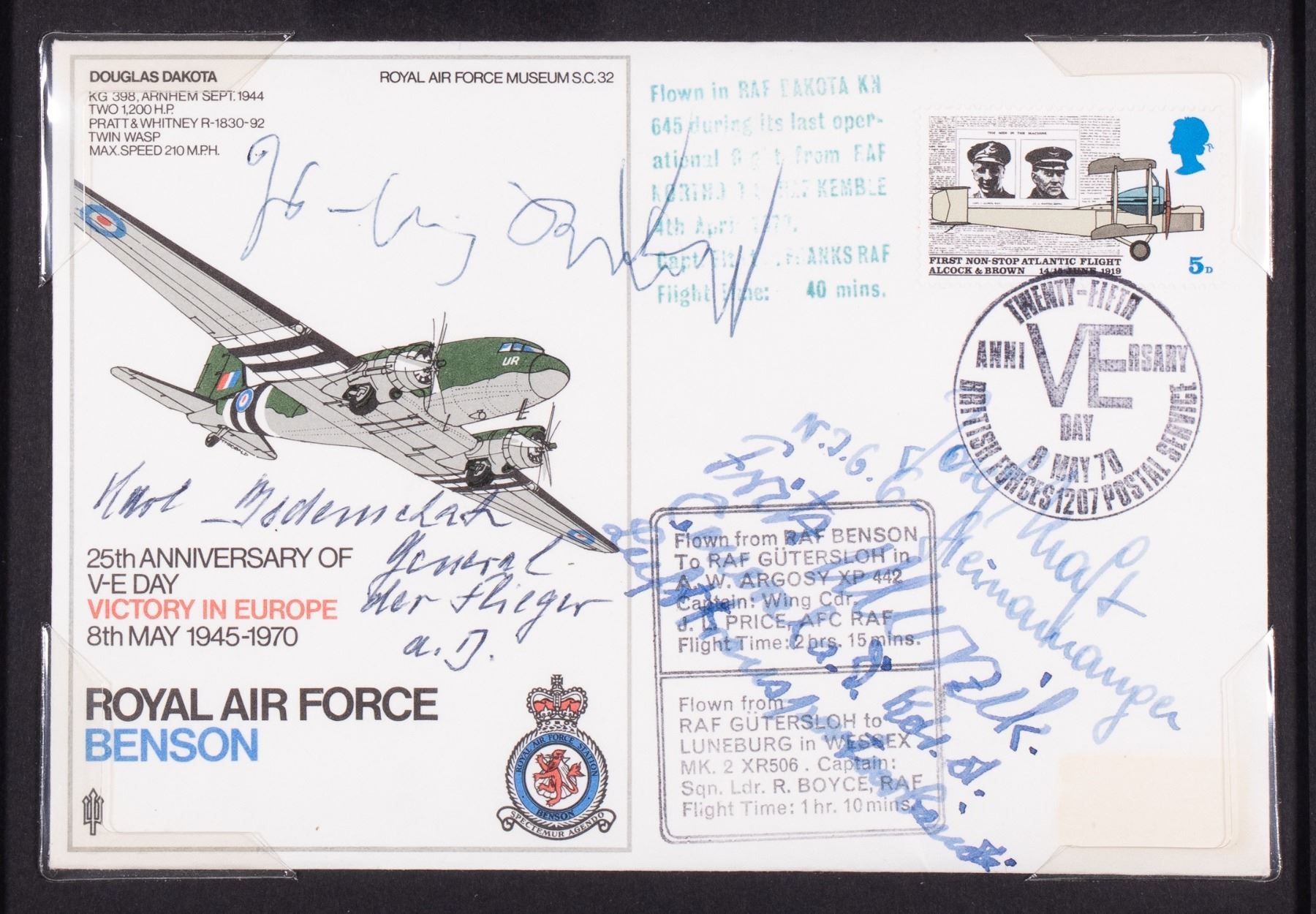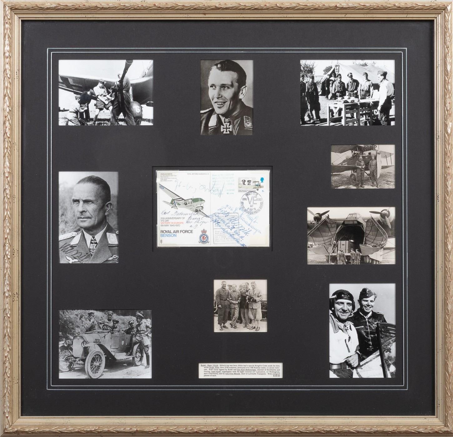 (1916-1982) German ground-attack pilot during World War II, most decorated German serviceman as the sole recipient of the Knight's Cross with Golden Oak Leaves, Swords, and Diamonds. British cover to commemorate the 25th Anniversary of V-E Day. The cover is signed by HANS-ULRICH RUDEL, General der Flieger KARL BODENSCHATZ, German fighter ace JOSEF KRAFT Nachtjagdgeschwader 6, and General FRITZ MORZIK, chief of the Luftwaffe transport command. The cover is placed in the center of a large framed collage, surrounded by photos of the officers. Cover is 4.25 x 6.25 inches. The overall frame dimension is 24.75 x 25.75 inches.