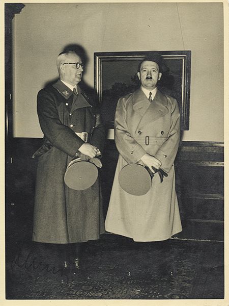 (1875 - 1947) National Treasurer of the Nazi Party from 1925 to 1945, convicted as a major offender and died in prison. S.P. 8" x 10" b/w, a Hoffmann-stamped press photo of Schwarz standing beside Adolf Hitler, both shown full-length, signed by Schwarz at bottom with at best fair contrast.