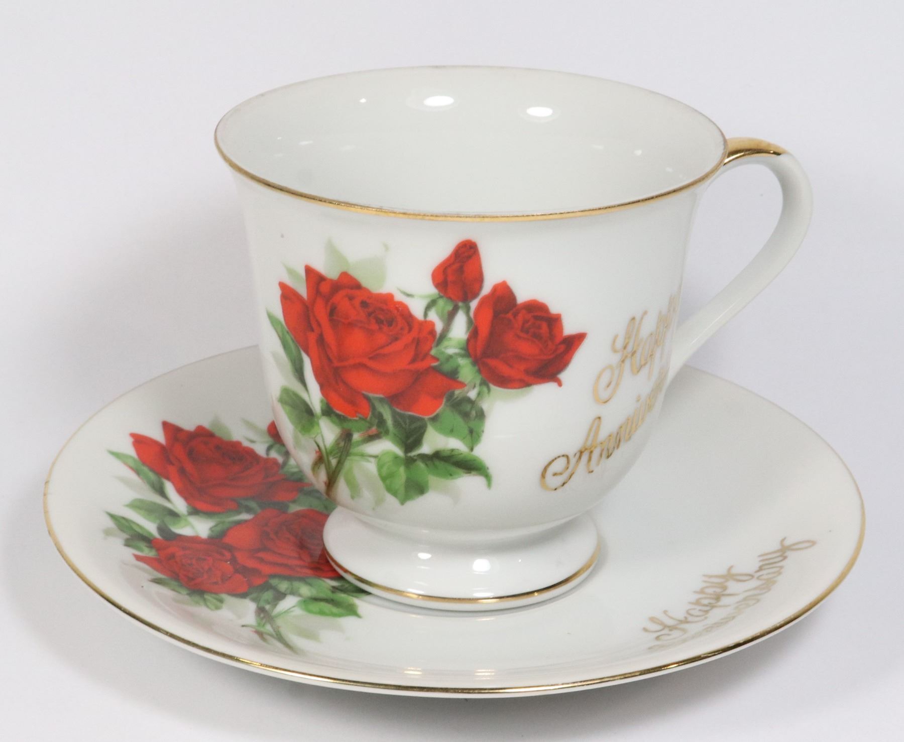 HAPPY ANNIVERSARY TEA CUP AND SAUCER ROSE PATTERN