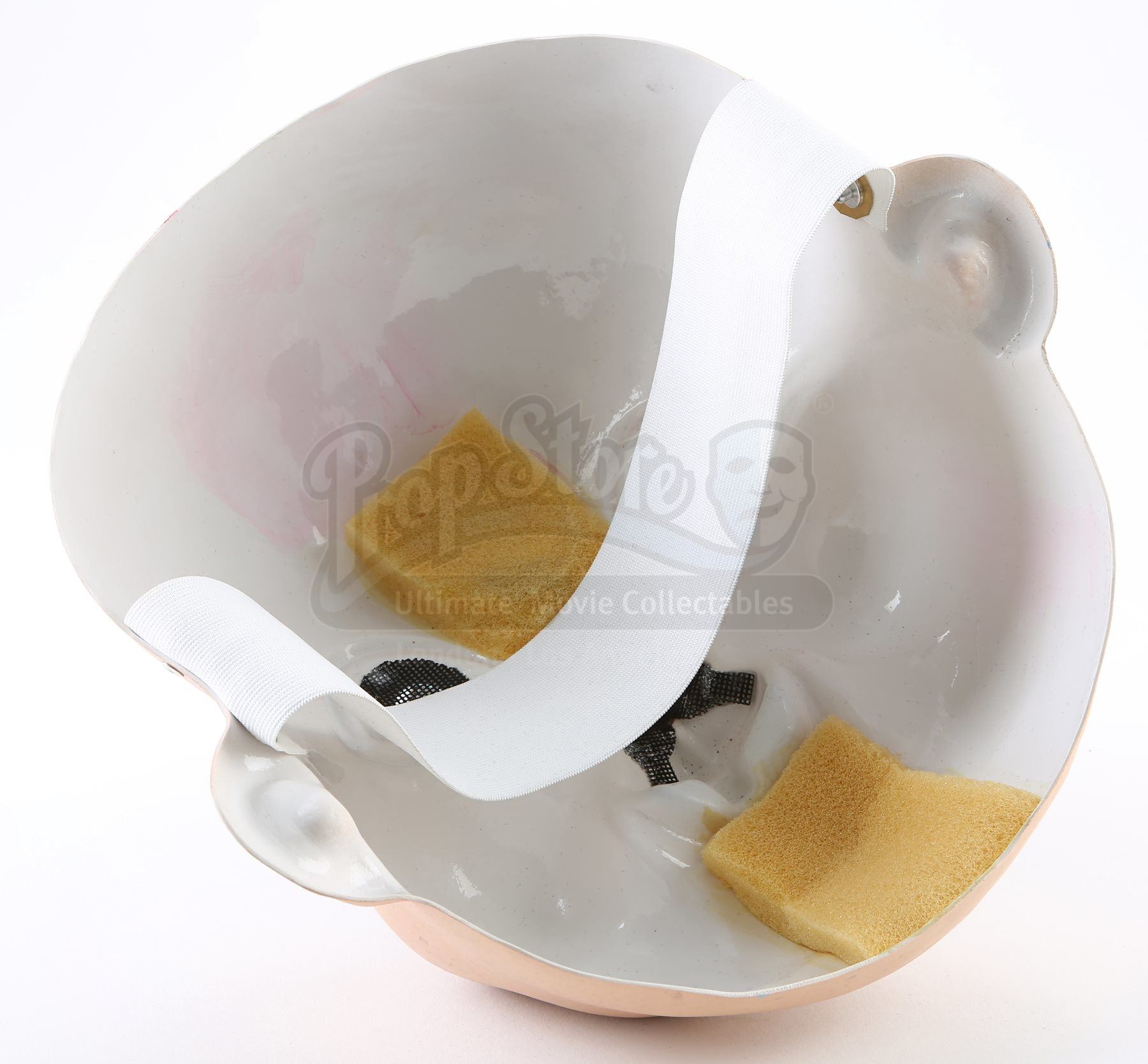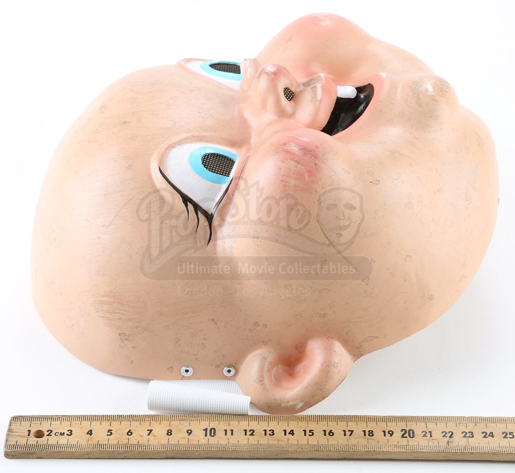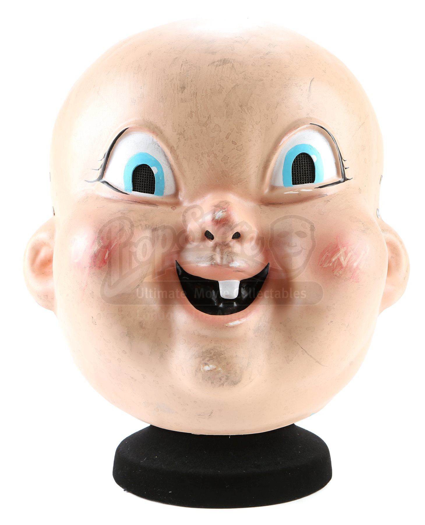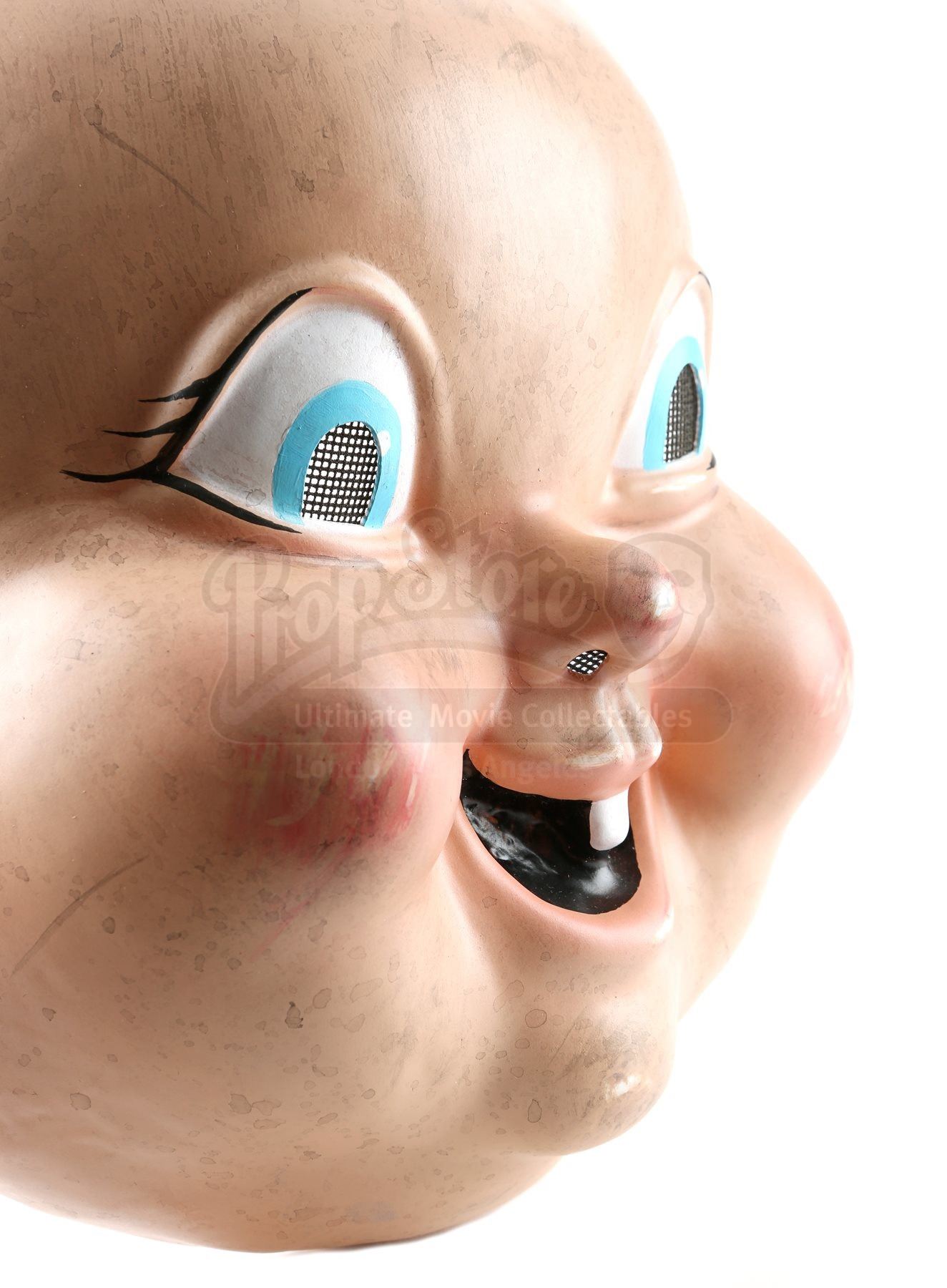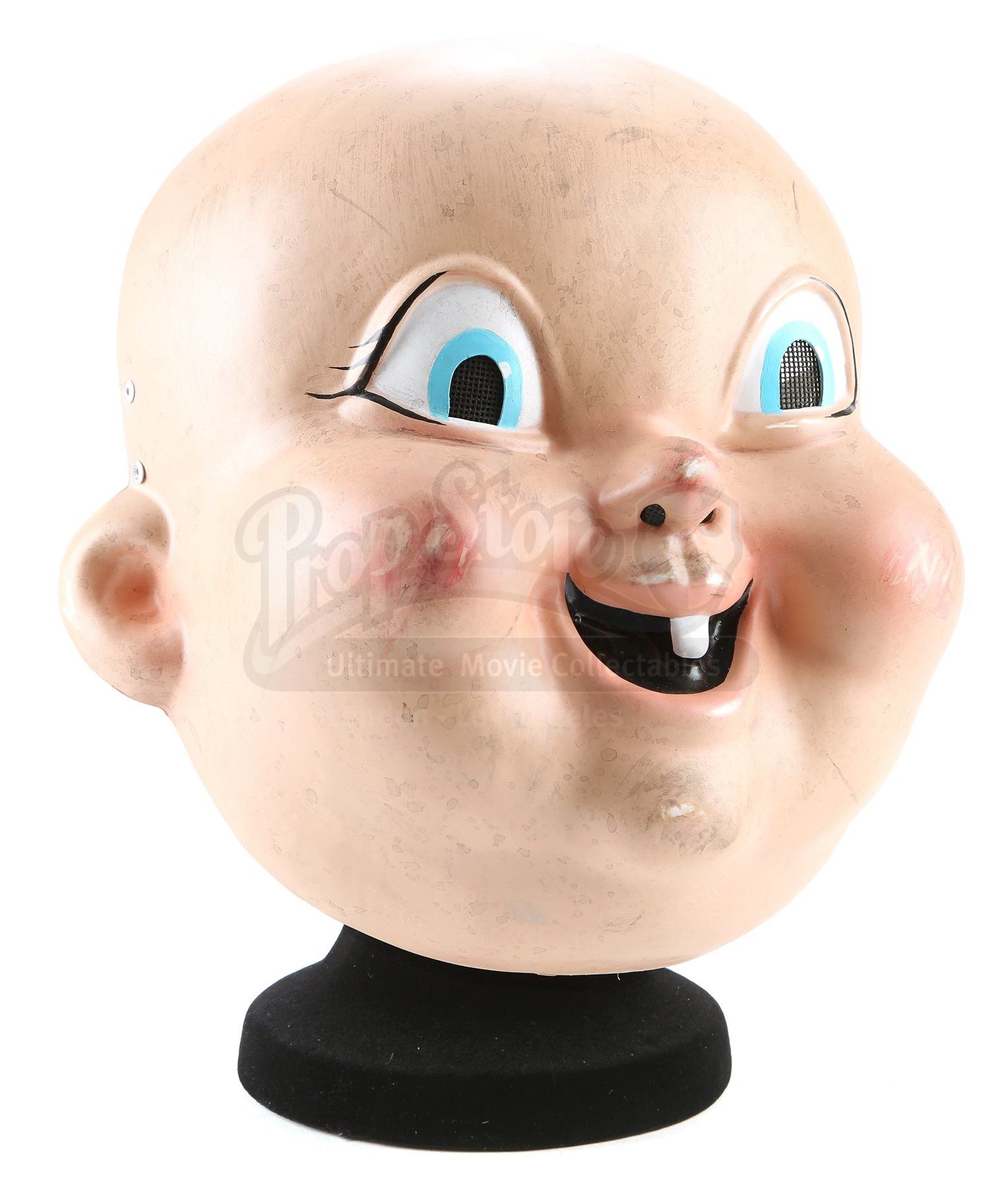 The killer’s mask from Christopher Landon’s time-bending horror film Happy Death Day. College student Tree Gelbman (Jessica Rothe) continually relived the day of her murder at the hands of a masked killer. Designed by Tony Gardner, the mask resembles a wide-eyed baby, grinning with a single tooth.