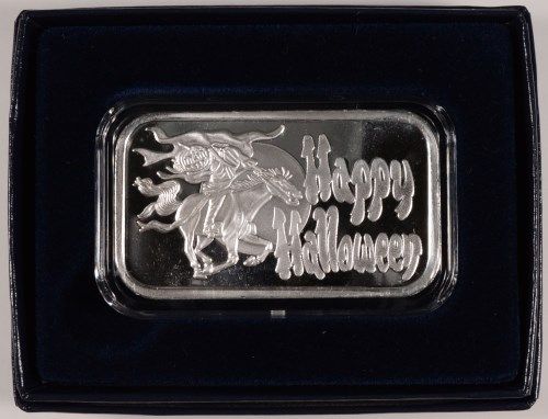 "HAPPY HALLOWEEN" ONE OUNCE .999 SILVER ART INGOT, HEADLESS HORSEMAN