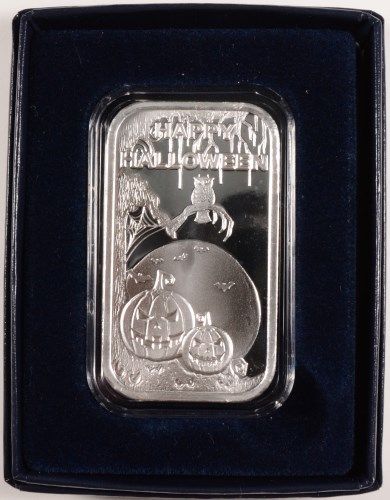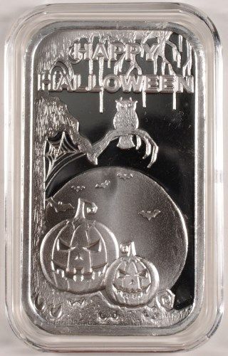 "HAPPY HALLOWEEN" ONE OUNCE .999 SILVER ART INGOT, PUMPKINS, SPIDERS, AND BATS