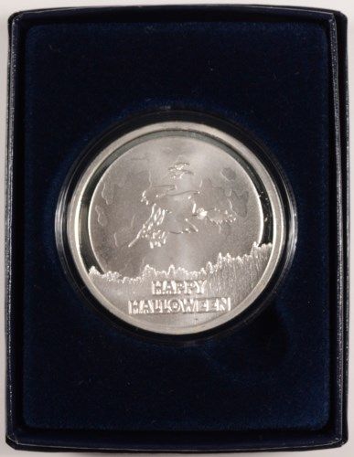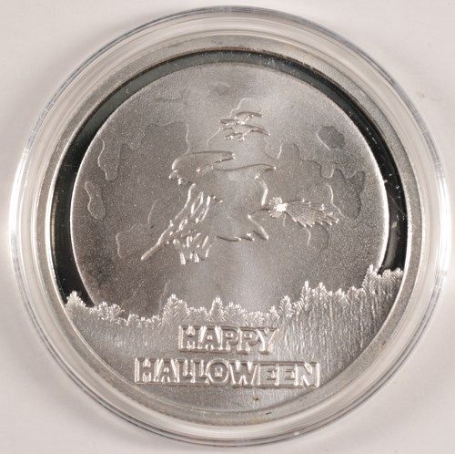 "HAPPY HALLOWEEN" ONE OUNCE .999 SILVER ART ROUND, WITCH RIDING BROOM