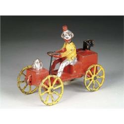 HAPPY HOOLIGAN AUTOMOBILE BELL TOY. Manufactured by N. N. Hill Brass Co. A great toy depicting Happy Hooligan driving his homemade Soapbox Derby. Finely painted in red enamel with silver, yellow and black highlighting. SIZE: 6”. CONDITION: Overall condition is very fine. JL 1-4044 (2,500-3,000)