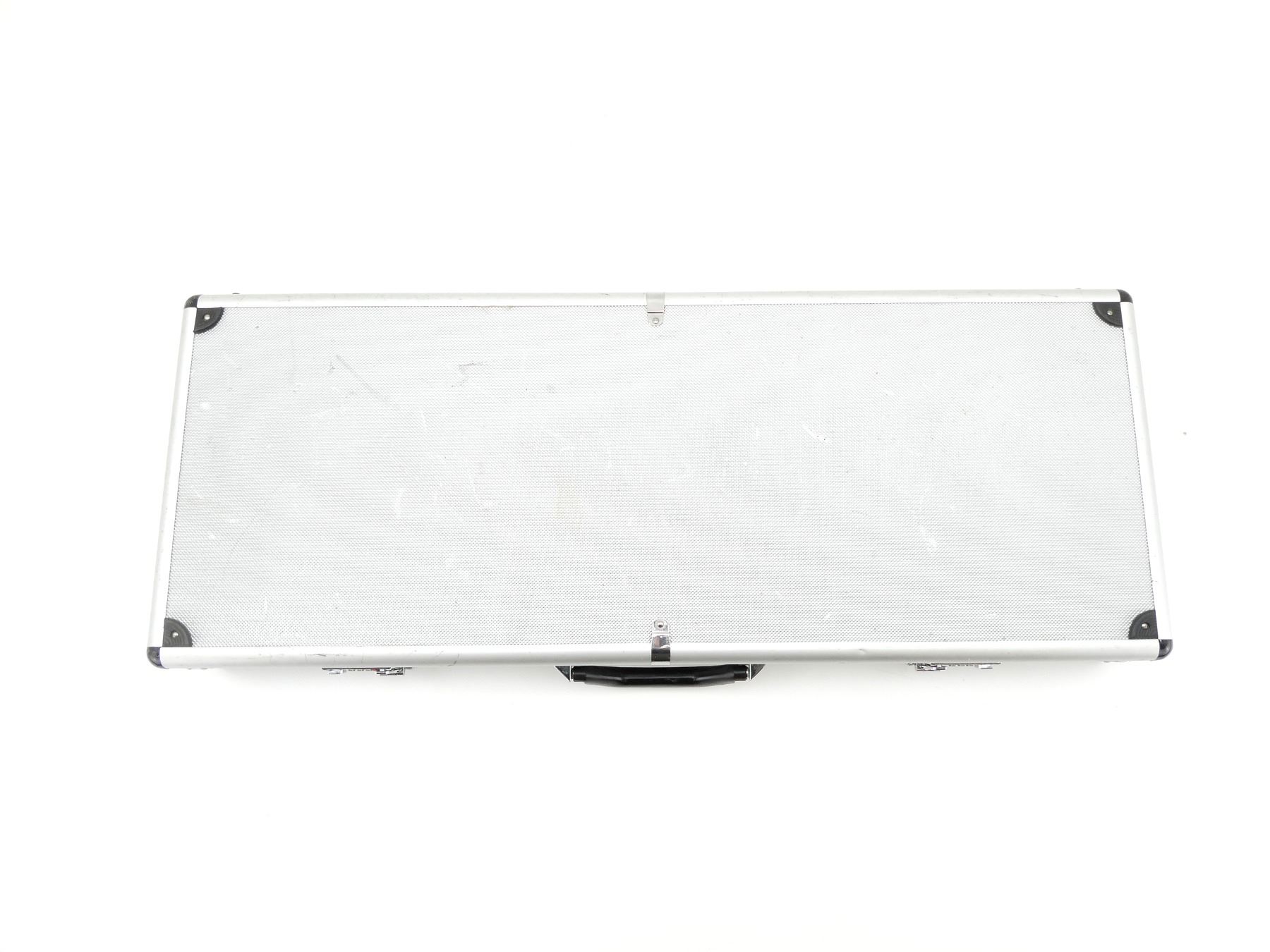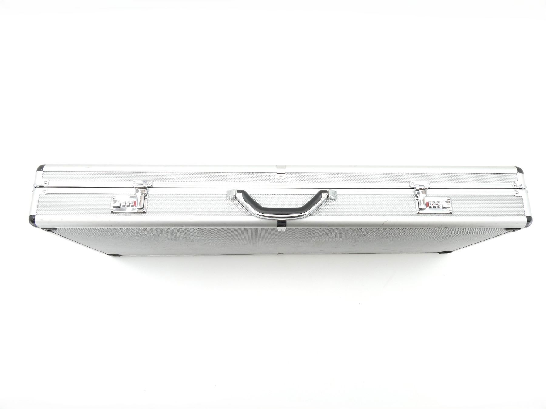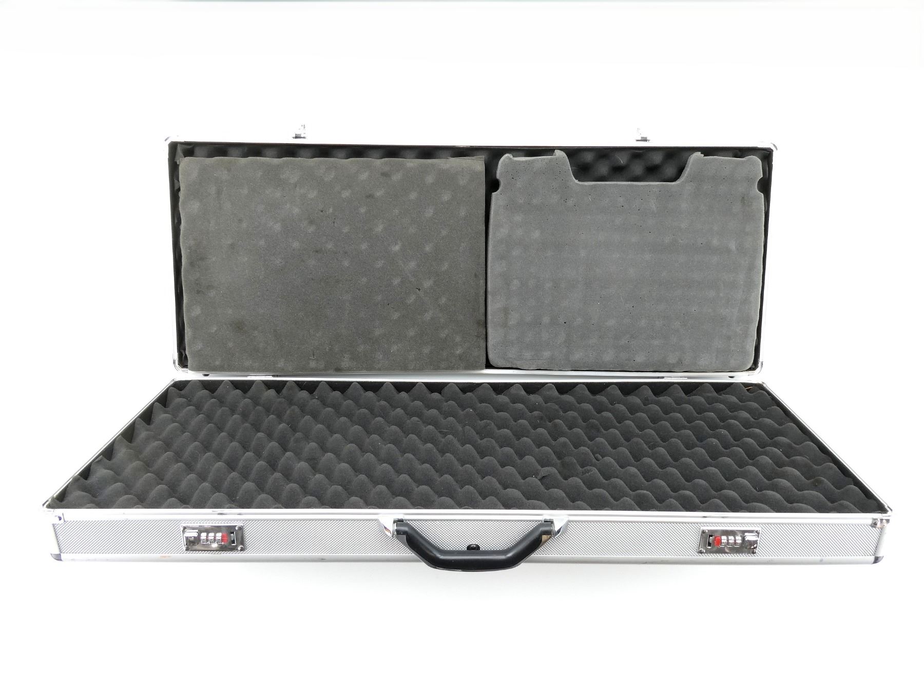 LOT INCLUDES; (1) SILVER HARD PADDED GUN CASE, CARRY HANDLE, (2) COMBINATION LATCHES, APPROX. OVERALL LENGTH 35", SHOWS WEAR AND TEAR FROM USAGE, SEE PHOTOS