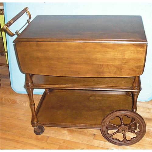 This tea cart is made of solid maple with a dark walnut finish. It features drop leaves and a brass & turned wood handle. It measures 31.5" long by 19.5" wide and is 29" tall. It is in fine condition and would make a wonderful addition to any diningroom.