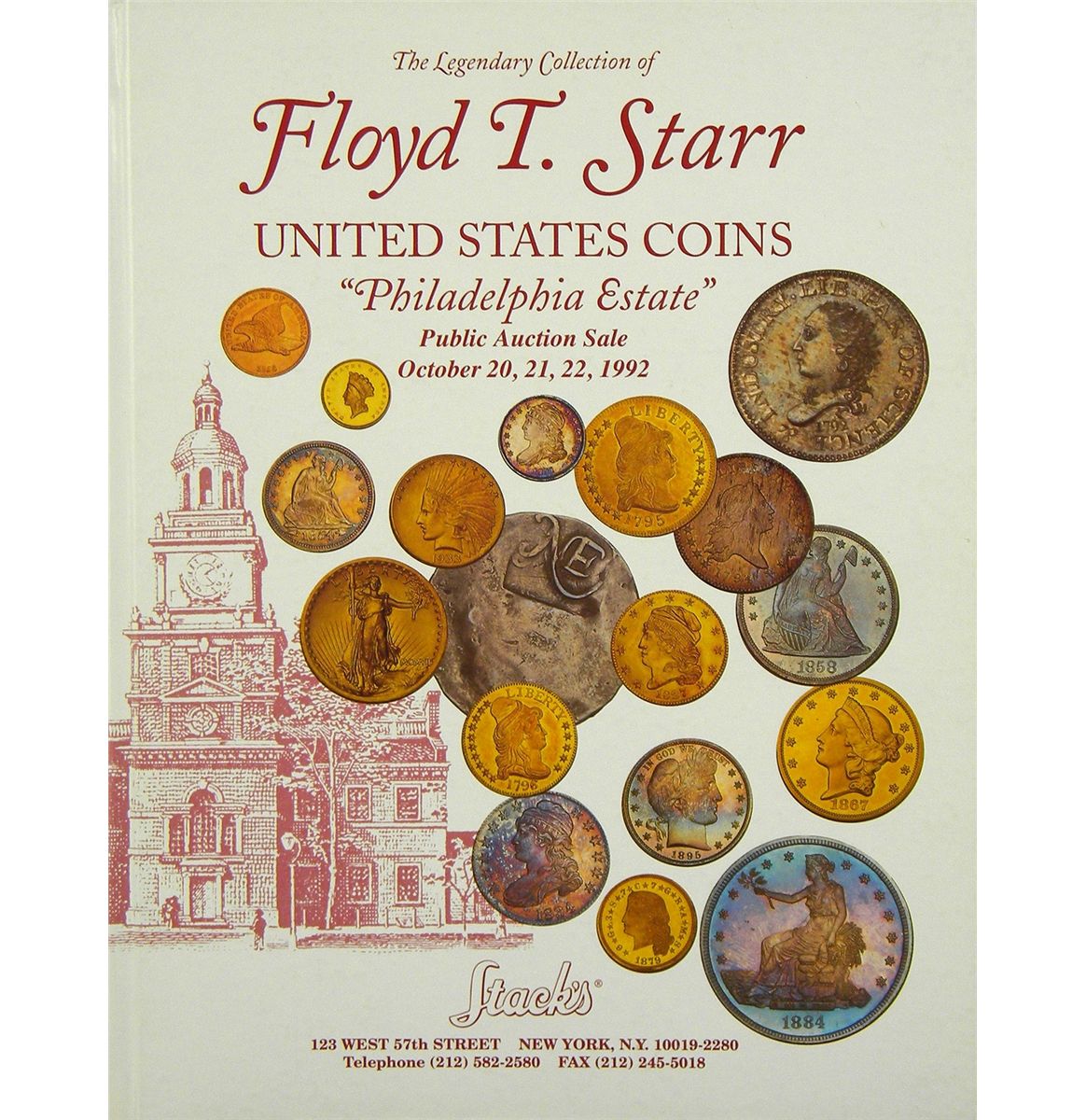 Stack’s. THE LEGENDARY COLLECTION OF FLOYD T. STARR: UNITED STATES COINS. “PHILADELPHIA ESTATE.” New York, Oct. 20-22, 1992. 4to, original pictorial boards. 179, (1) pages; 1366 lots; illustrated throughout and on 24 color plates; PRL laid in. Fine. Special Hardcover Edition. One of 200 copies, autographed by Norman, Harvey and Larry Stack.