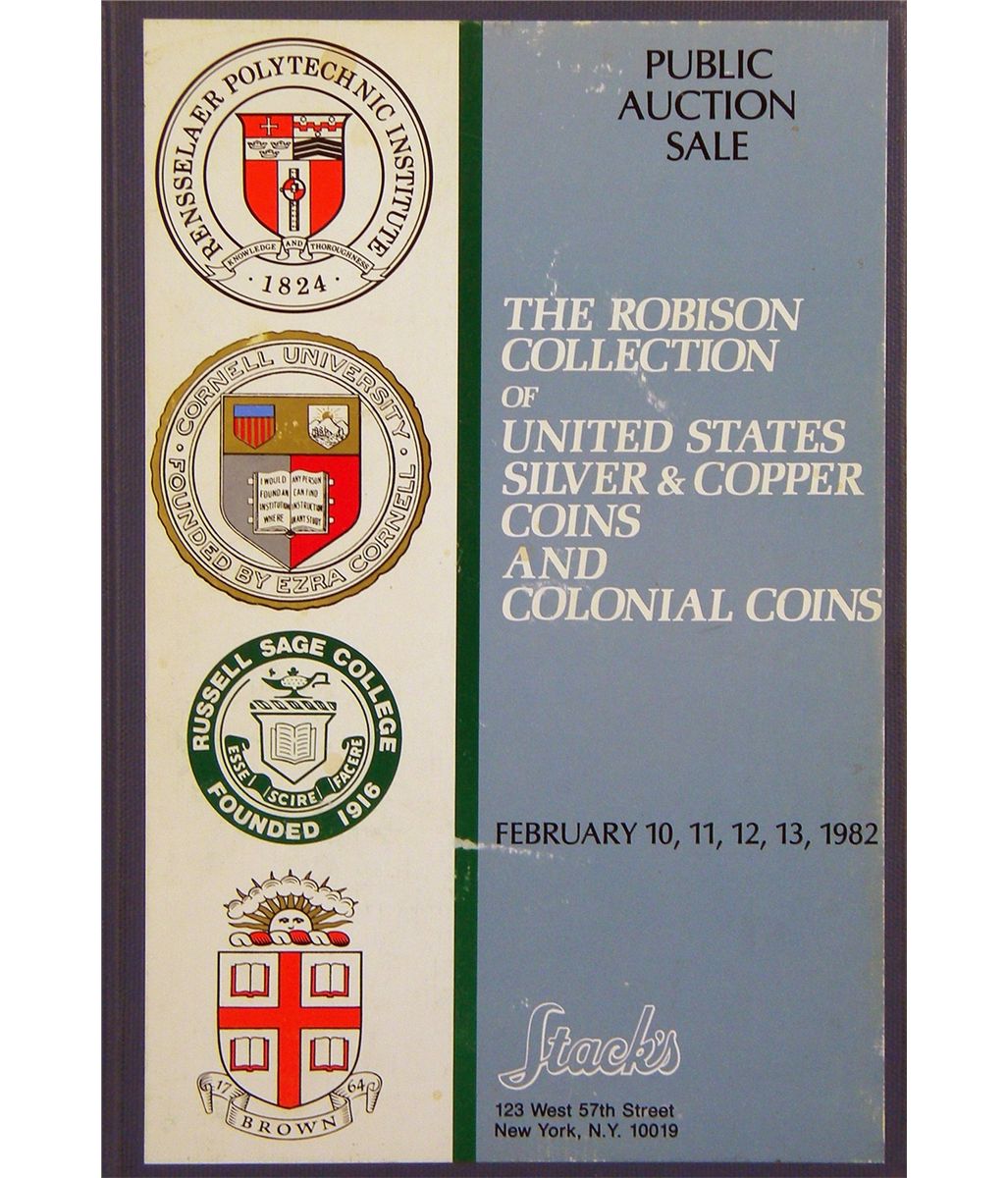 Stack’s. THE ROBISON COLLECTION OF UNITED STATES SILVER & COPPER COINS AND COLONIAL COINS. New York, Feb. 10–13, 1982. 8vo, original blue cloth, gilt; original pictorial card cover mounted on front. 283, (1) pages; 2049 lots; text illustrations; 8 color plates. Prices realized list laid in. Fine. The Special Hardbound Edition. Scarce.