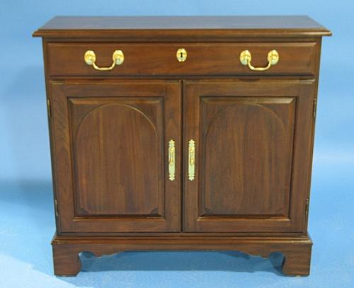 HARDEN CHIPPENDALE STYLE CONSOLE STAND. Single drawer at top over two doors. Bracket feet. Marked on inside of drawers. Drawers are dovetailed. Shows minor surface scratching at top. 30.25" H, 32" W, 11.25" D