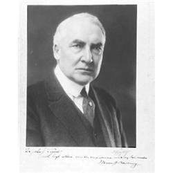 (1865 - 1923) Twenty-ninth President of the United States. Superb oversize I.S.P. 10" X 13" sepia (with mat 15" x 20"), a dramatic head and shoulders portrait by EDMONSTOY, boldly inscribed in the blank mount beneath the image: "To John J. Tigert with high esteem, much confidence and my best wishes Warren G. Harding". Additionally signed by the photographer. A slight fold to bottom right corner, light, even toning, overall very good condition. Ideal for display!