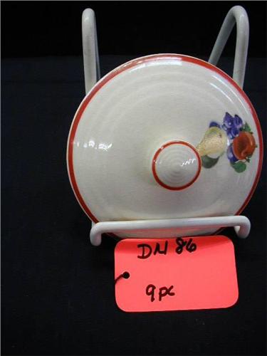HARKERWARE POTTERY CO. INCLUDES (1) 9in RED APPLE 2 SWIRL W/RED TRIM BOWL, (2) 7in SAUCERS RED APPLE 2 W/RED TRIM (1 W/STRESS CRACK), (4) 7 1/8in PLATES RED APPLE 2 SWIRL W/RED TRIM,(1) 7 1/8in PLATE RED APPLE 2 W/RED TRIM (BROWNING), (1) RED APPLE 2 W/RED