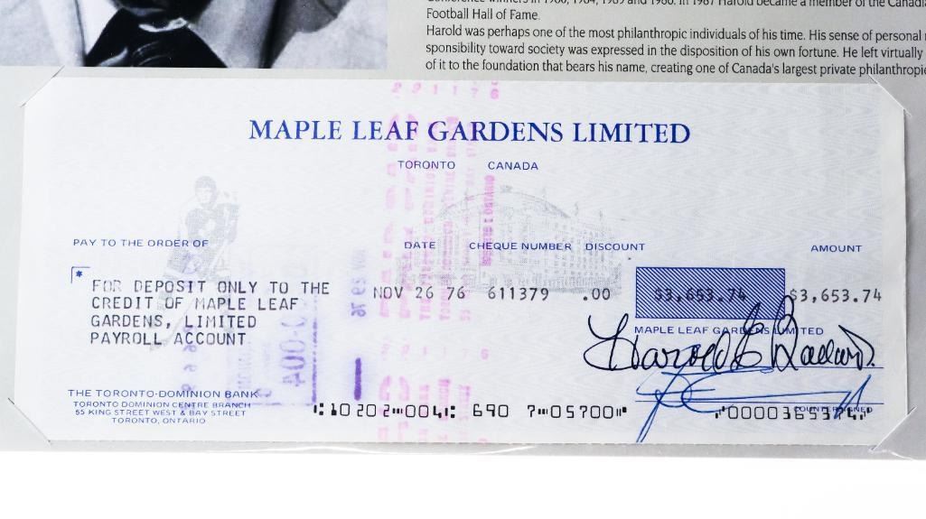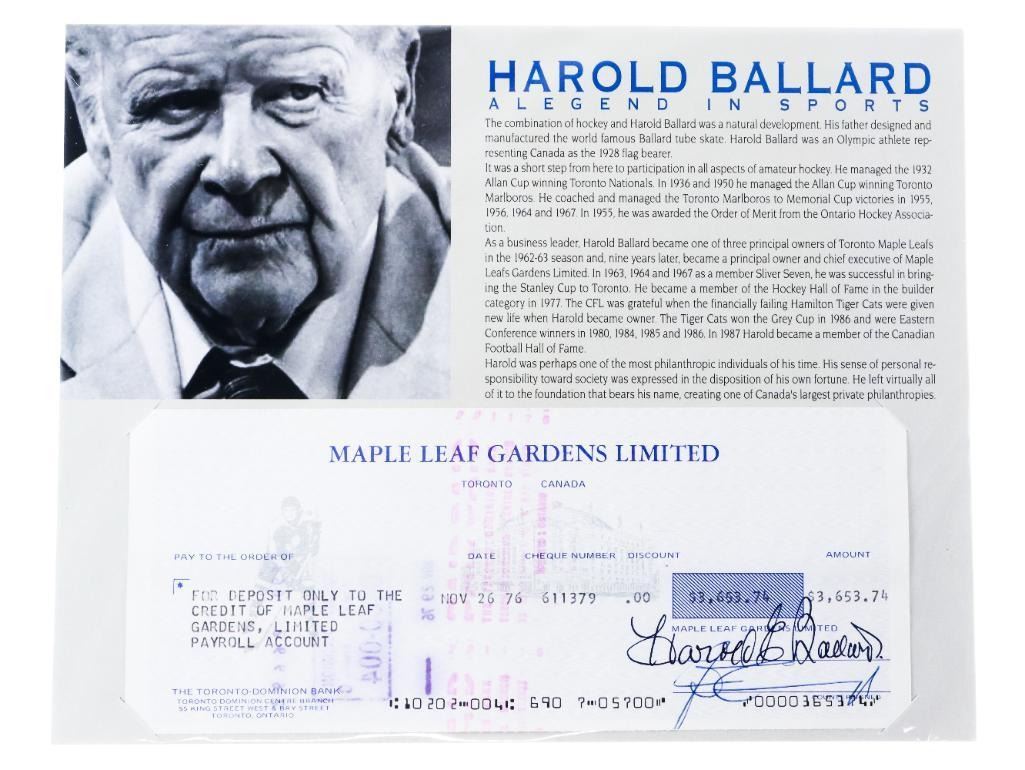 HAROLD BALLARD A Legend in Sports - Maple Leaf Gardens Vintage Cheque Hand Signed by Harold Ballard, on Giclee Art Display