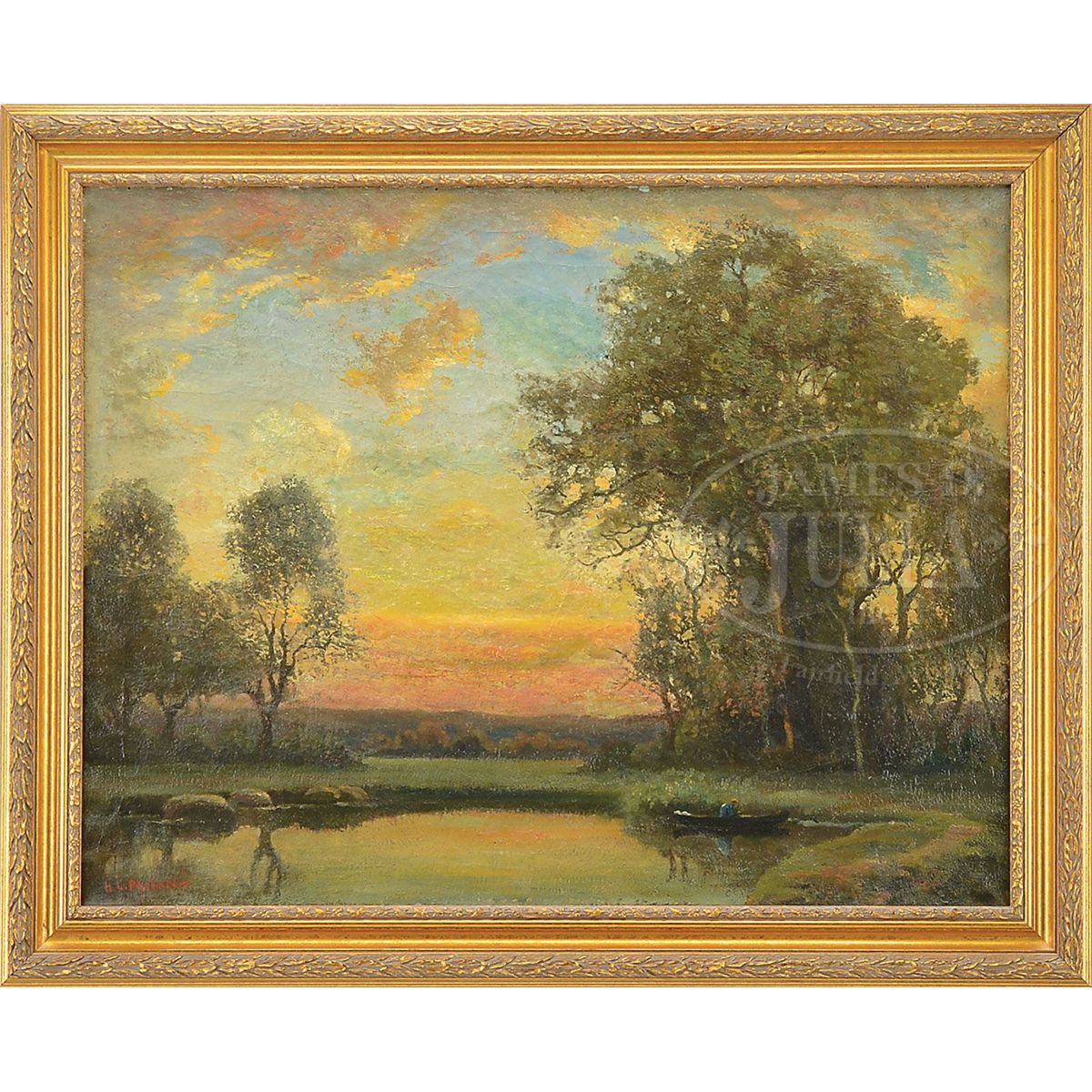 HAROLD LEE PHELAN (American, 1881-) SUNSET LANDSCAPE WITH POND AND BOAT