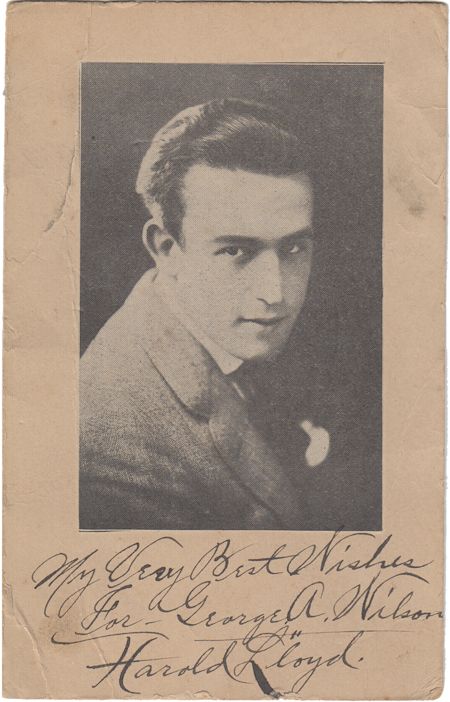 (1894 - 1971) American film comedian who portrayed a shy, insignificant bumbler in Hal Roach comedies. I.S.P. 3 1/2" x 5 1/2" b/w, a printed postcard with Lloyd's image affixed on verso, boldly inscribed and signed: "My Very Best Wishes for George A. Wilson Harold Lloyd". Light wear, very good.