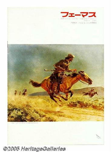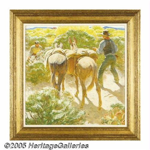 <B>HAROLD VON SCHMIDT (1893-1982)</B></I> <BR>The Ghost Lode<BR>Original Magazine Story Illustration <BR>American Magazine, April, 1950 <BR>Caption: 'The old man shouted, 'Hey!' The young man smiled, but he didn't answer.' <BR>Oil on canvas <BR>30in. x 30in.<BR>Signed lower left: Von Schmidt <BR>Provenance: Morris Weiss collection <BR>A Japanese language Harold Von Schmidt catalog picturing the work is included. This work was pictured in <I>Harold Von Schmidt Draws and Paints the Old West</B></I> by Walt Reed.<BR><BR>Condition Report: Overall excellent condition<BR>