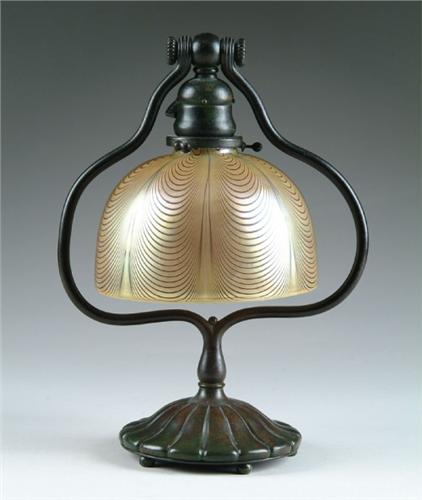 HARP DESK LAMP. Beautiful Tiffany bronze harp base has deep brown patina with rich green highlights. Signed on the underside "Tiffany Studios New York 419". The Tiffany base supports a contemporary art glass shade with gold iridescent background and green loop panel design. SIZE: Shade is 7 in. dia. Lamp is 13 in. t. CONDITION: Some fraying to old silk cord, otherwise very good to excellent. 5-60793