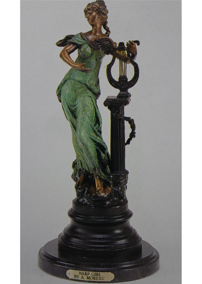 "HARP GIRL" BRONZE SCULPTURE - AFTER A. MOREAU - BEAUTIFUL COLOR PATINA - MOUNTED ON A FINE ITALIAN MARBLE BASE - BEAUTIFULLY DETAILED - SIGNED - MINT CONDITION - 21"H X 8"W - LOST WAX CAST BRONZE