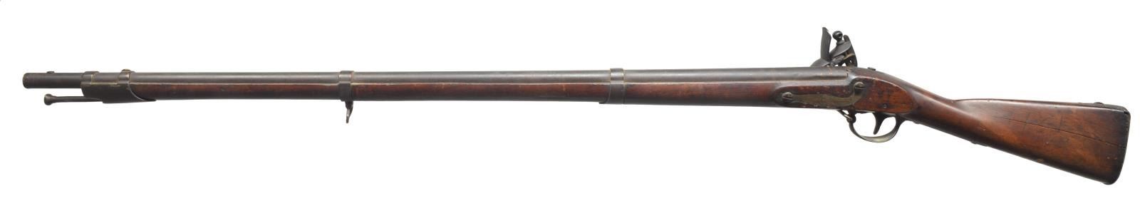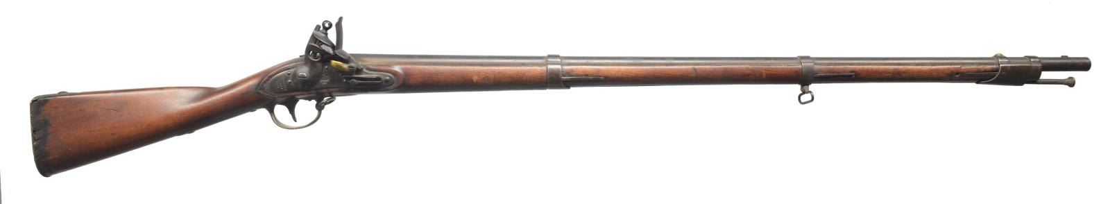 Cal. 69. NSN. Bbl. 42". Lock & bbl. have 1836 Date. 3 Band walnut stock w/ iron fittings & button tipped ramrod. Left ear of stock has "V / JAS" marking w/ other indistinguishable marks. CONDITION: bbl. & lock finish has faded to a dark patina showing corrosion & light pitting. Fittings have faded to a mottled patina finish. Stock shows heavy wear w/ dents & handling marks. Area around buttplate shows water damage showing numerous cracks & chips. Cracks are found extending from both ends of lock w/ chip below lock. Dark heavily pitted bore. (01-18229/DS). ANTIQUE. $1,200-1,800.