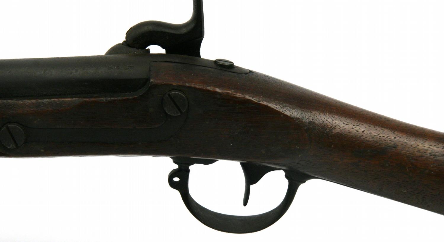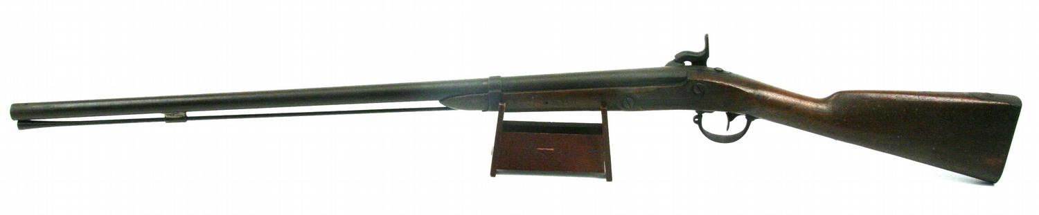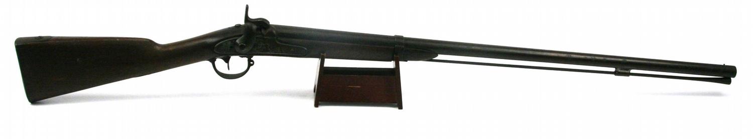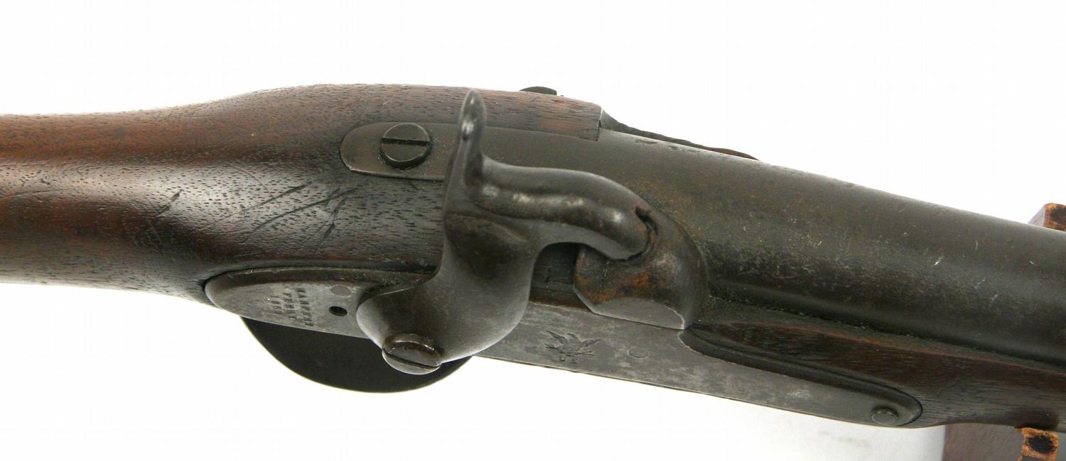 69 caliber percussion musket, marked "Harper's Ferry / 1830". Stamped eagle and US on lock plate. "V" over "P" over eagles head inspection marks on barrel. Inspection cartouche "ELS" on left side of stock. Stock is shortened. Eye for ramrod appears to show later repair. Good dark patina over barrel and metal. Parts appear in good mechanical order. Overall good condition.