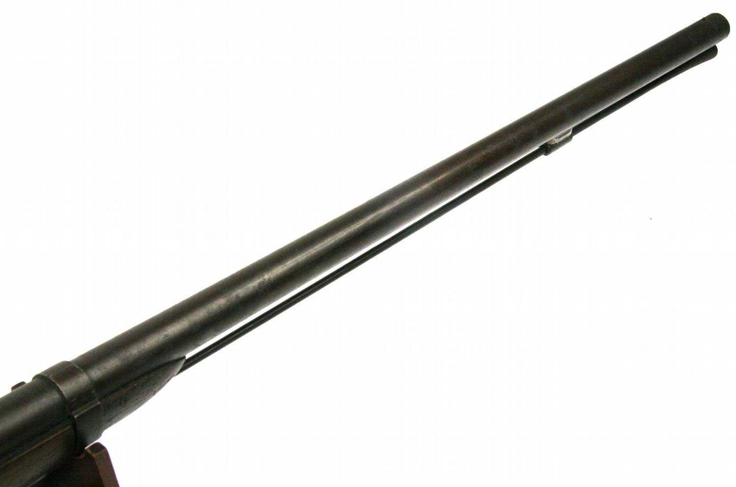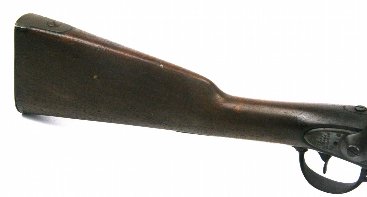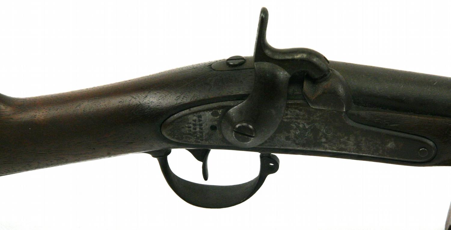 69 caliber percussion musket, marked "Harper's Ferry / 1830". Stamped eagle and US on lock plate. "V" over "P" over eagles head inspection marks on barrel. Inspection cartouche "ELS" on left side of stock. Stock is shortened. Eye for ramrod appears to show later repair. Good dark patina over barrel and metal. Parts appear in good mechanical order. Overall good condition.