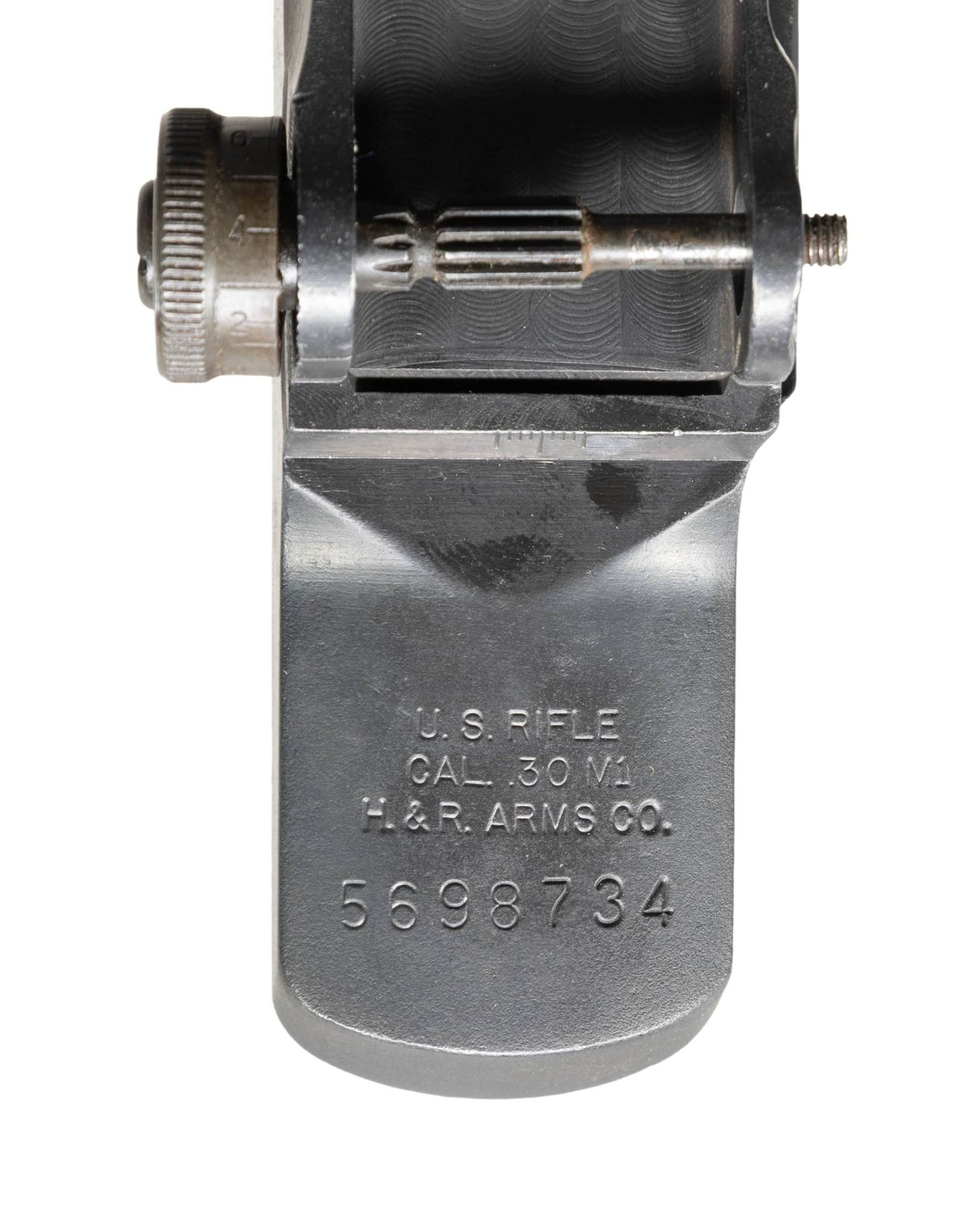 CONVERTED FOR BERETTA BM59 MAGAZINES. S# 5698734. Receiver marked on the heel "U.S. RIFLE / CAL. .30 M1 / H.&R.ARMS CO." & serial number. Receiver drawing number has been removed during the machining process in order to accept a Beretta BM59 magazine. Rear sight is not complete. Rear sight windage knob & pinion are present w/ Beretta & HRA marking. Provision is made below the receiver ring for the standard Beretta magazine catch. Catch marked "PB" & BM 59. The HRA marked trigger housing assembly is additionally marked PB BM59. The hammer & safety are marked "HRA". Trigger is marked "PB". The floorplate has been extensively modified to accept the detachable magazine. Correct magazine catch is fitted at rear. Beretta winter trigger is installed. Stamped trigger guard. The bolt is marked w/ "HRA" drawing number & ".U.". Additional marking applied is "PB BM 59" & electro-penciled "P". Bolt assembly is marked "HRA". CONDITION: the receiver retains nearly all of its arsenal rework parkerization over scattered fine pitting, which is below the wood-line & on the forward end of the receiver ring. Balance of parts retain 75% of their parkerized finish w/ thinning & light wear. When the trigger guard is fastened to the receiver, a BM59 magazine(not included) appears to fit correctly. (25-4374/RW). MODERN. $300-500.
