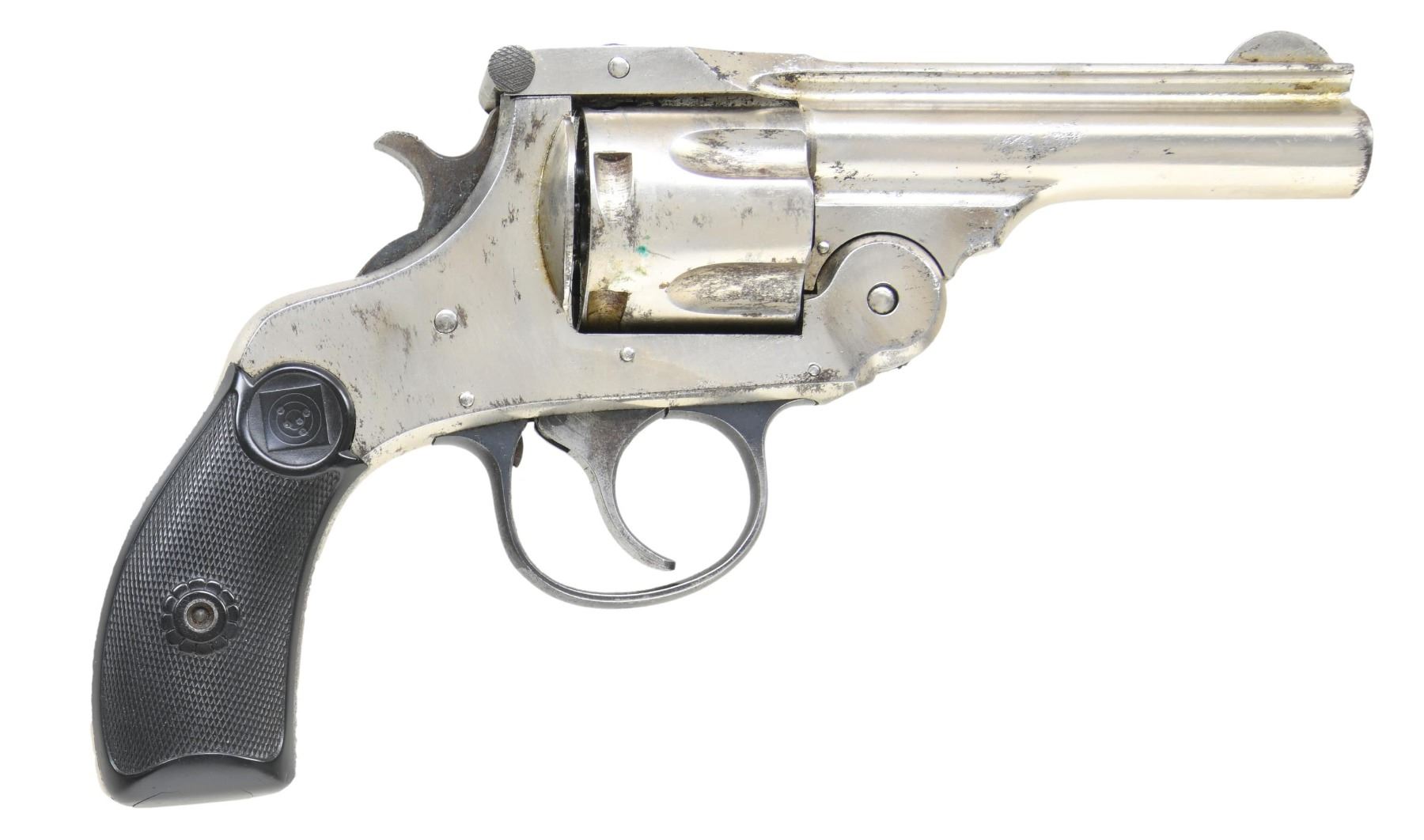 3RD MODEL DA REVOLVER. Cal. 38 S&W. S# 375647. Bbl. 3.25" w/ "38 S&W CTGE" on left side. Rib has H&R address and blade front sight. 5 Shot fluted cyl.; matching numbered cyl. & ejector. Nickel finish. Two piece hard rubber grips. CONDITION: fair nickel w/ cleaned pitting, patina & wear. Good grips. Good bore with pitting. Gunsmith attention need, frame hand unable to catch cyl. indexes to cycle. (25-2663/MD). CURIO. $50-70.