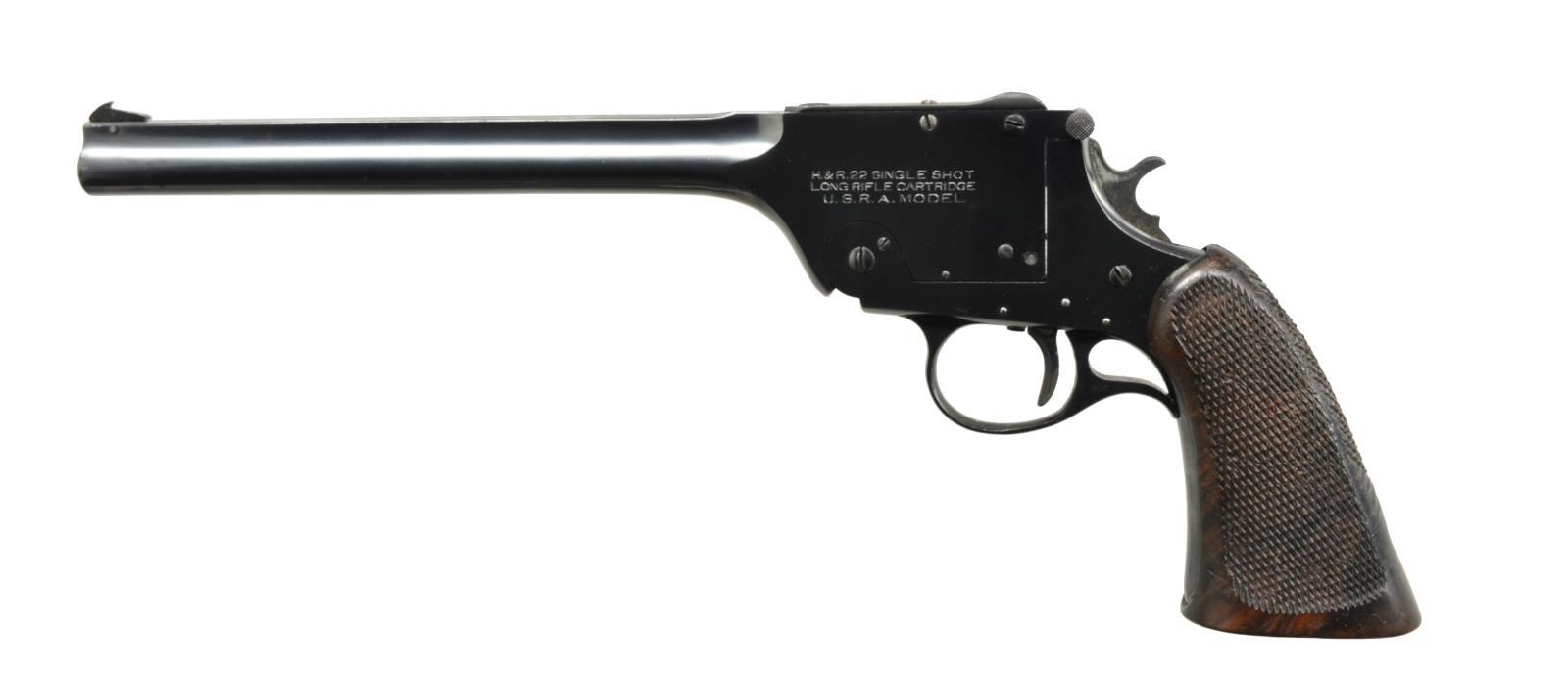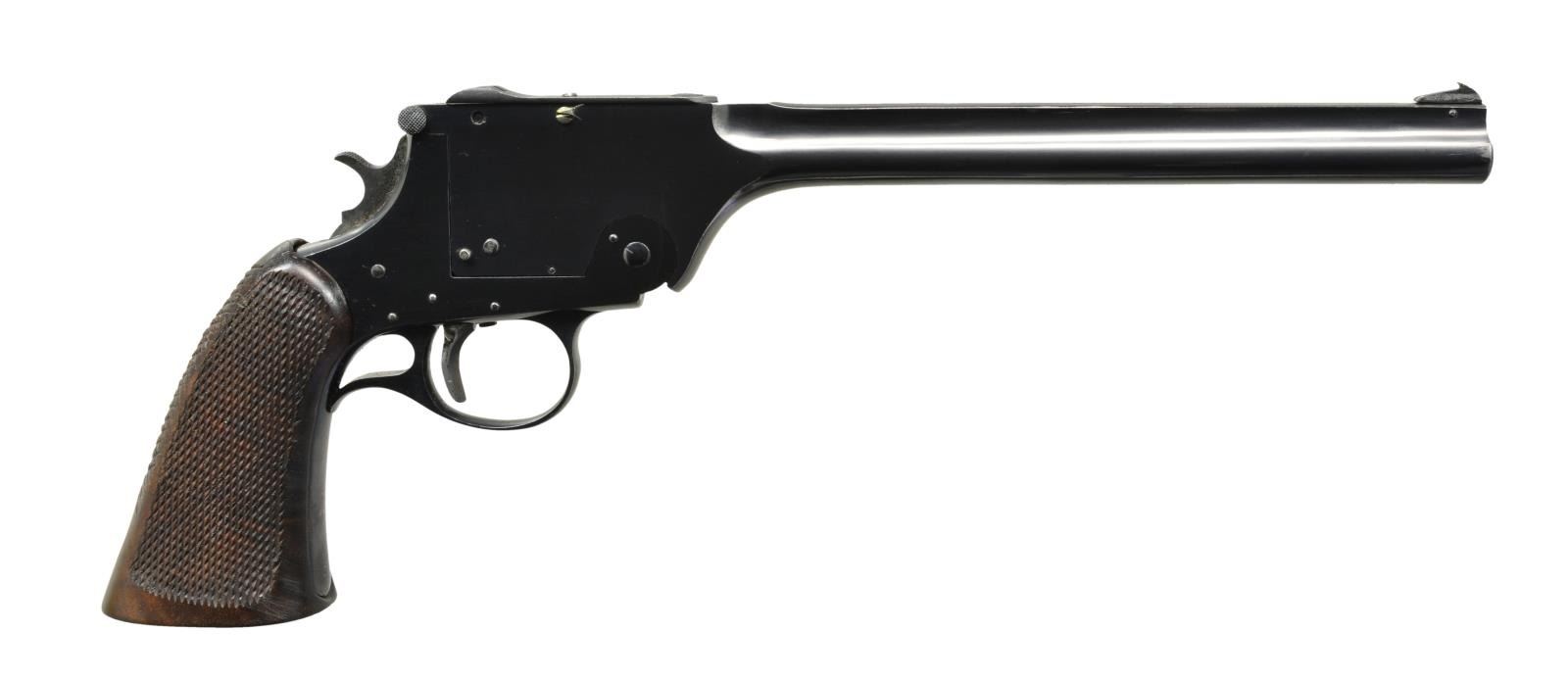 BREAK SINGLE SHOT PISTOL. Cal. 22 LR. S# 1596. Bbl. 10" w/ rib, blade front sight & adj. square notch rear sight. Blue finish. 1 Piece checkered walnut oversized grip. Mfg. 1928-1942. CONDITION: over 95% original blue showing slight muzzle & edge wear w/ scattered spots of freckling. Grips show light scratches & marks. Crisp mechanics. Very good bright bore. (20-1474/DS). CURIO. $900-1,400.