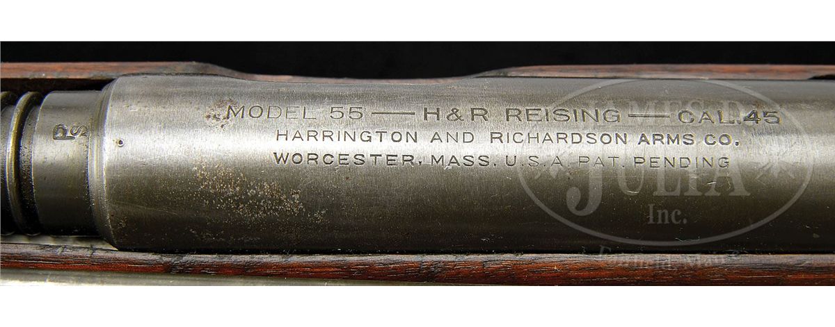 SN 70997. Cal. 45 ACP. 10" bbl. This Model 55 Reising is registered as a Model 50 and includes an orig web sling, three 20 rnd "H&R Reising Model 50" magazines in a web case and two 30 rnd unmarked after-market magazines as well as an orig soft paratrooper drop case. One of the 20 rnd magazines is smooth sided with a deep lustrous blue the other 2 are parkerized and have corrugated sides. Although Soldiers preferred the Thompson or the folding stock M-1 carbine to the Reising model, the consignor states that the fact this fired 45 ACP from a closed bolt gave impetus to accuracy, particularly when firing on semi-automatic. Firing mechanism functions smoothly when operated by hand. This weapon passes function test and appears fully functional. PROVENANCE: Collection of Carl "Bill" Morrison. CONDITION: Overall finish and appearance is very good. About 60% orig finish thinning and faded to a pleasing gray patina overall. Magazine has a much deeper blue luster finish but also has loss of finish, particularly on high spots. Wooden stock is very fine with numerous handling marks but no cracks or chips. There is some slight bruising to wood where the shoulder loop touches the wood when in folded position. Bore could use a cleaning but is shiny and bright. Bolt face and receiver could also use a cleaning but are extremely fine. Sling is soft and supple, and although soiled, is completely functional. Drop case is also somewhat soiled but otherwise in very fine condition and marked "8300-44 2650". The desirability of this seldom seen registered example of a paratrooper weapon is only augmented by the inclusion of the original drop case. 4-48661 JWK19