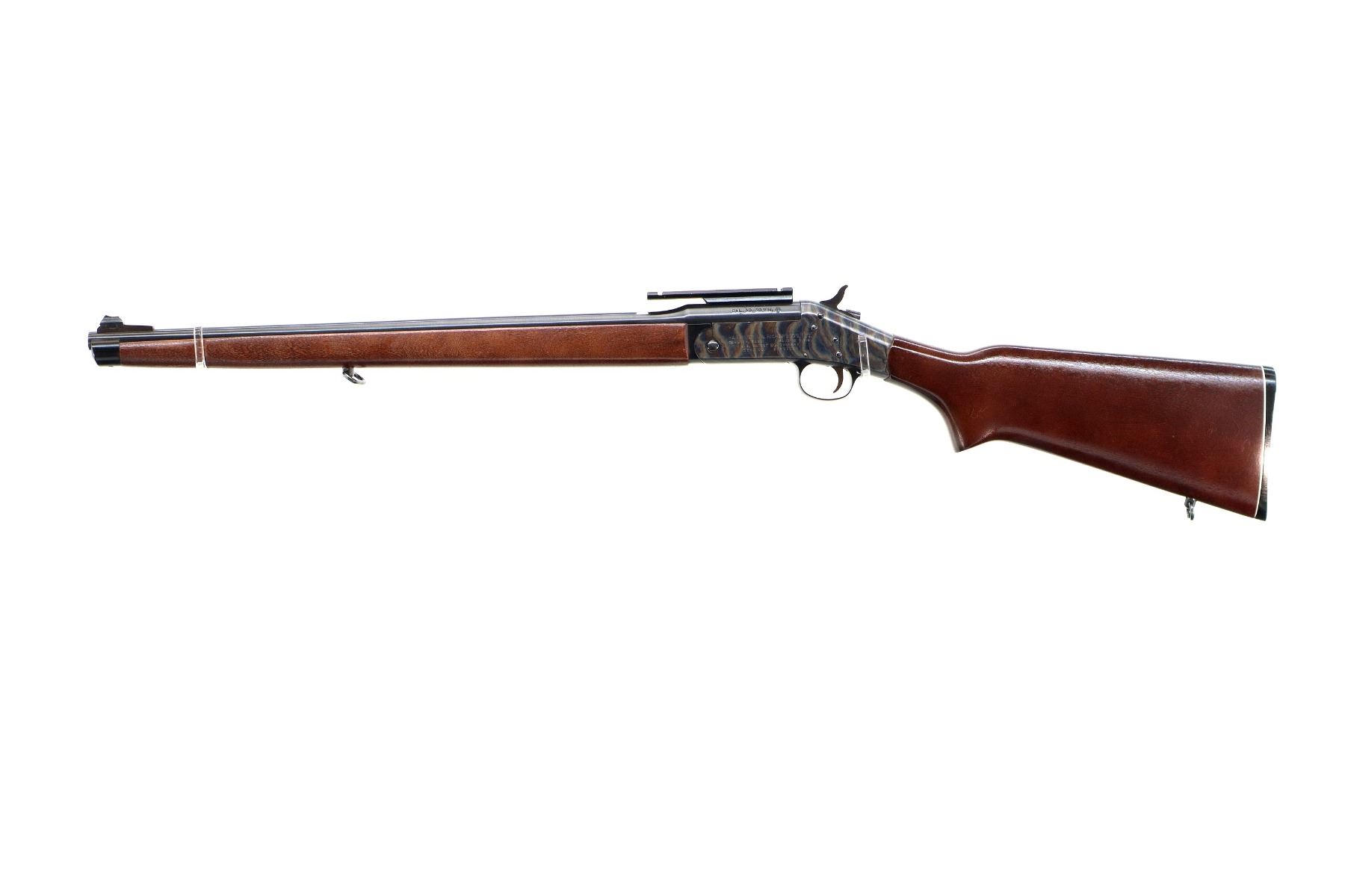 Main Description: Broken blade front sight with ramp, missing rear sight dovetail present, blued round barrel drilled and tapped at rear with one piece scope base installed, colour case hardened receiver, grooved spur hammer, smooth opening lever, ejector. Two piece wood stocks, full length forearm, pistol grip, grooved black polymer butt plate, sling swivels, steel nose cap.