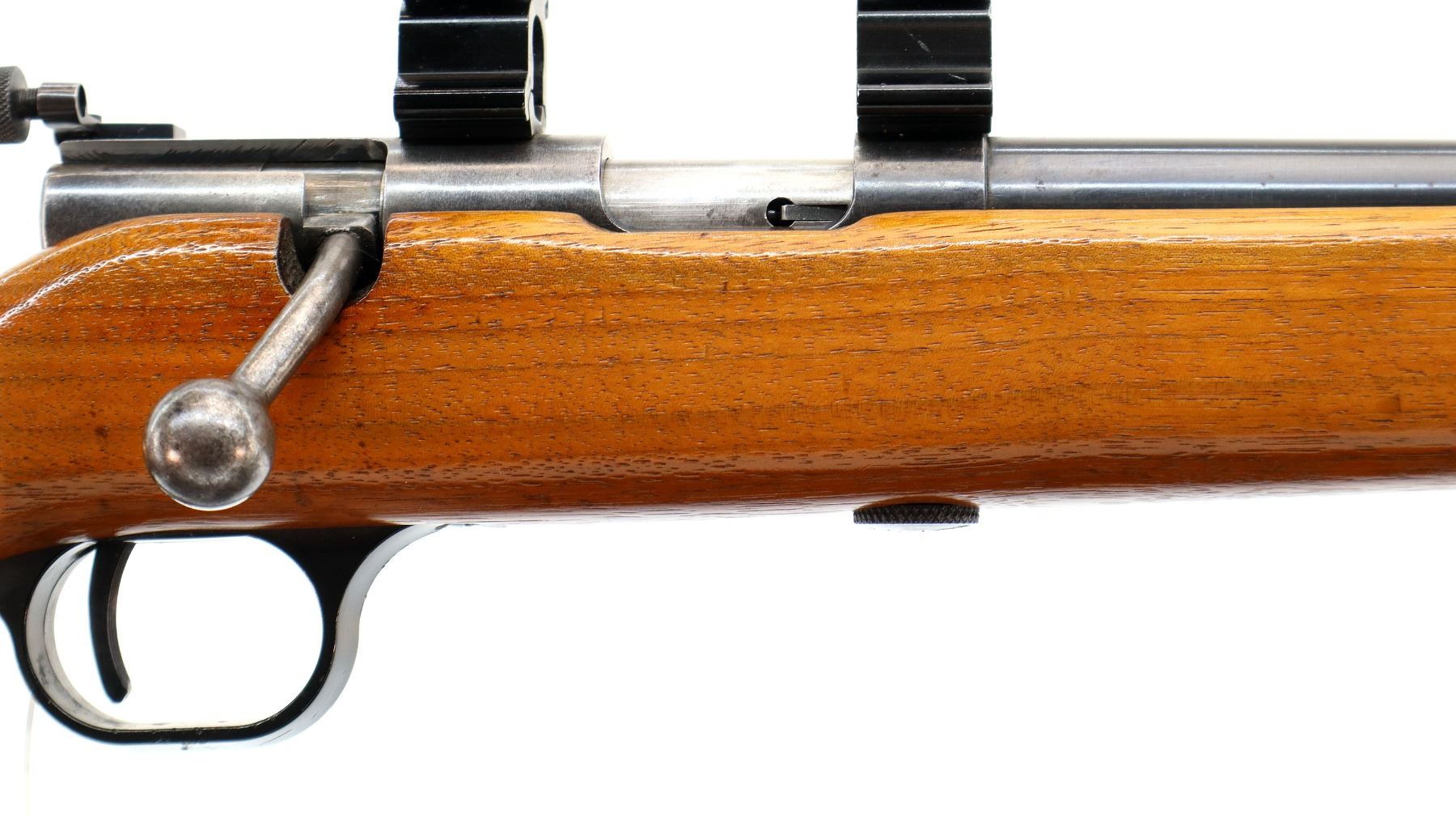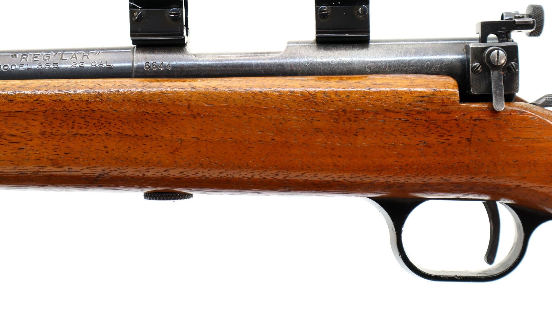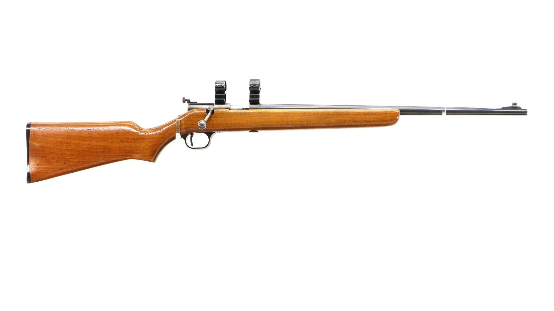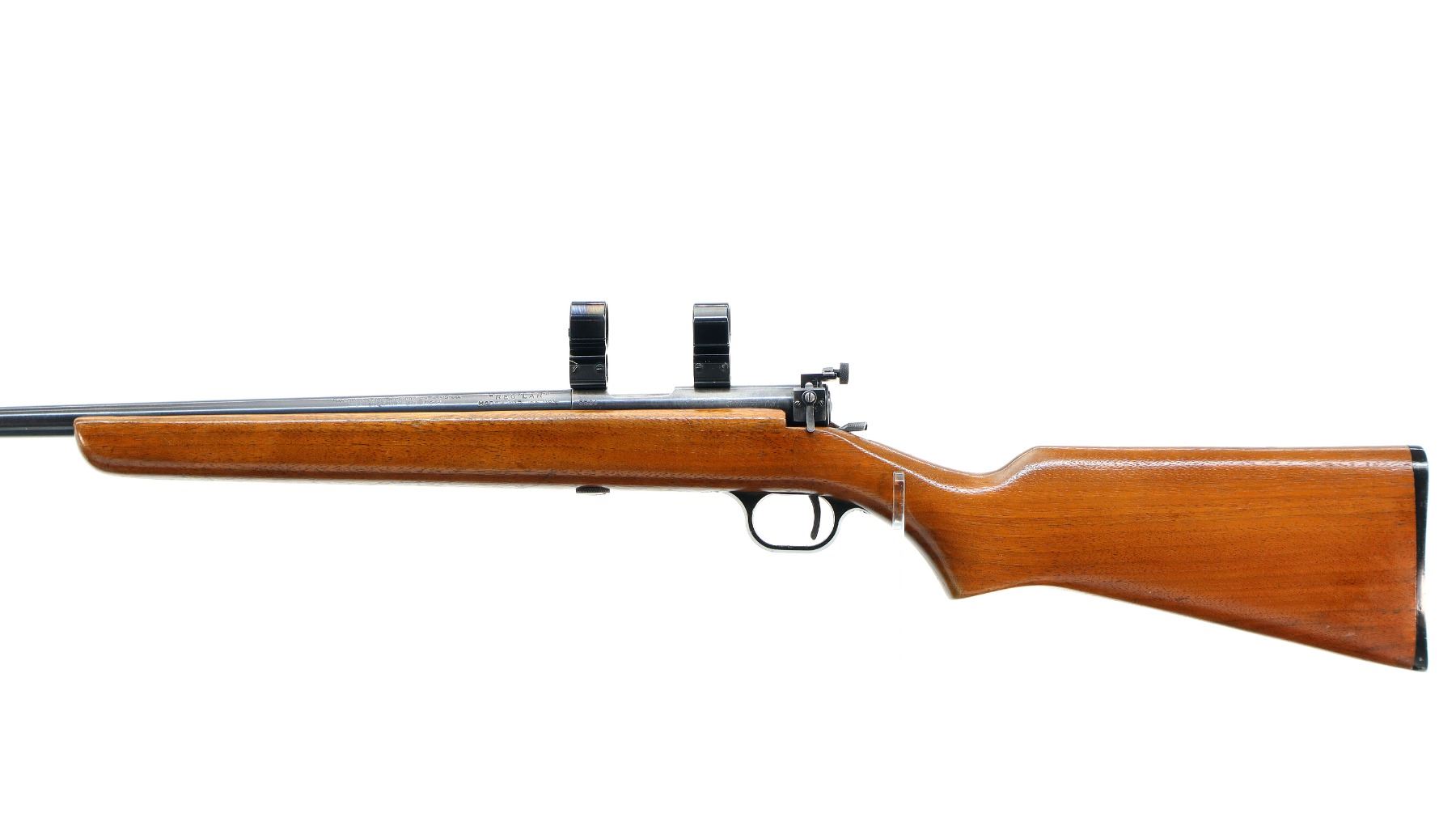 Main Description: Blade front sight with ramp, adjustable rear peep sight, blued finish, receiver drilled and tapped with 1" rings installed, left side of receiver has faint markings etched into it. One piece wood stock, pistol grip, checkered black polymer butt plate