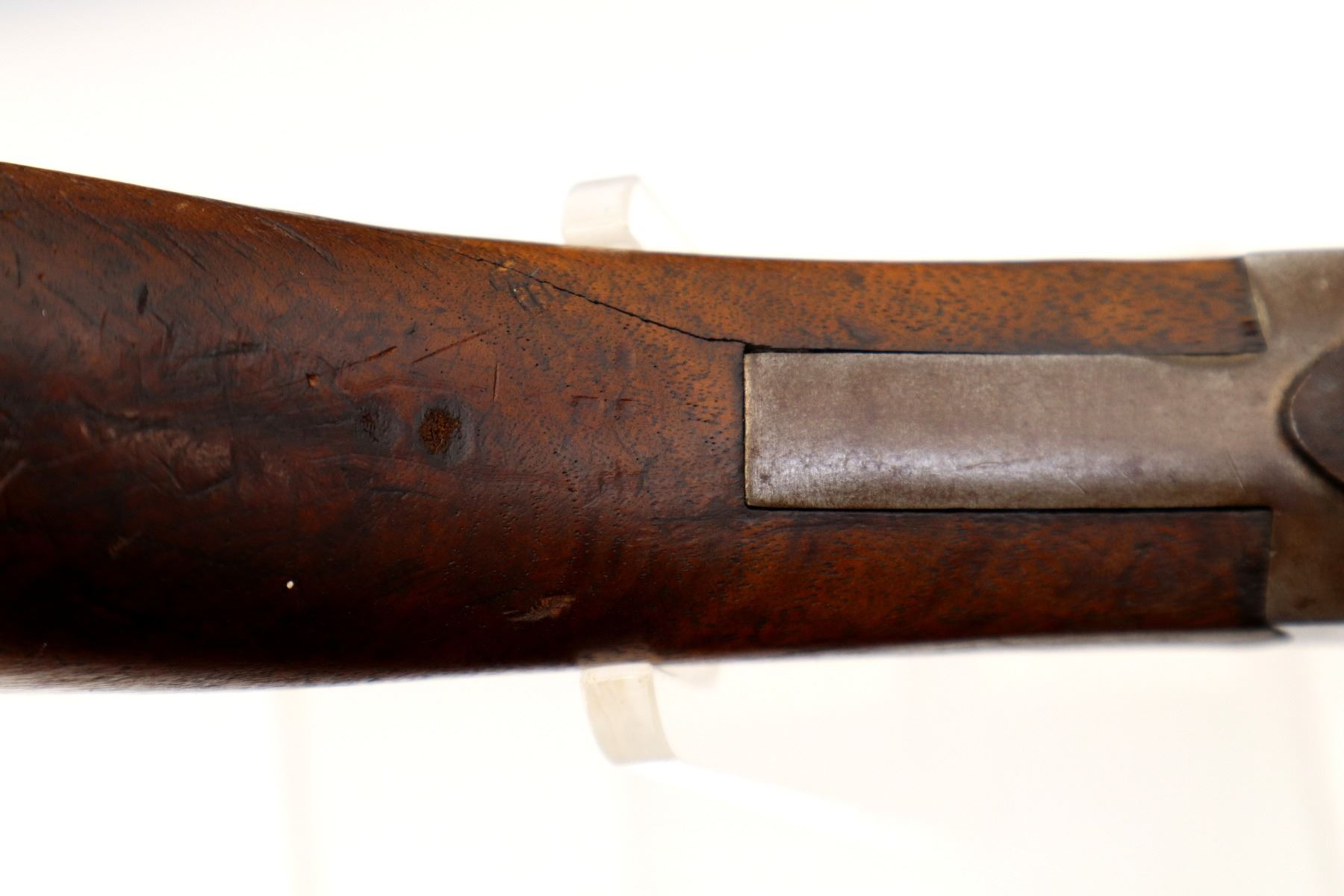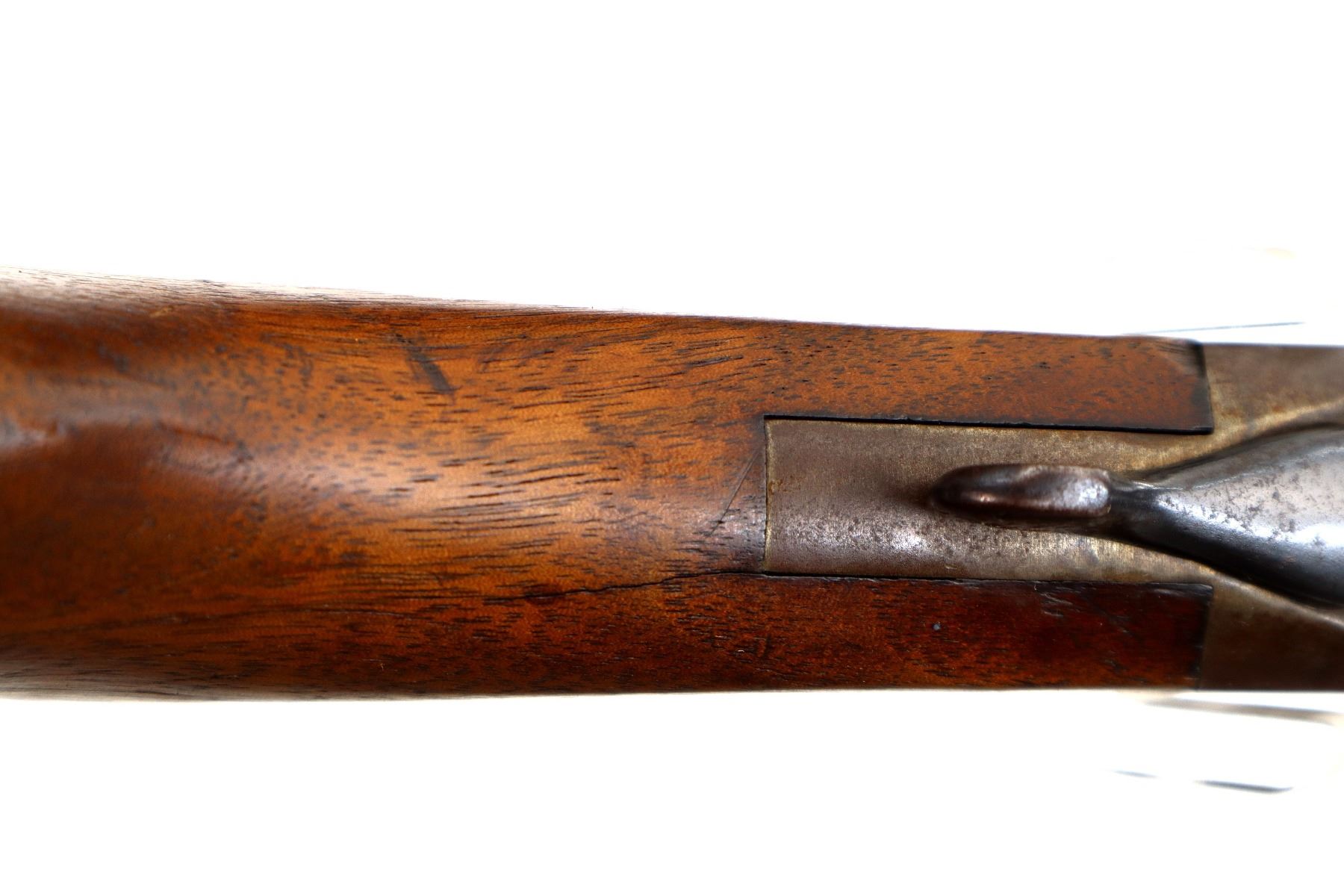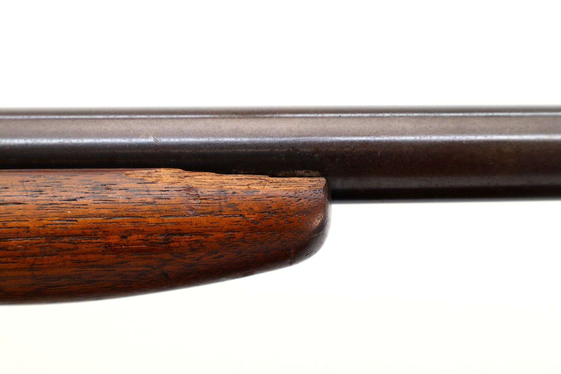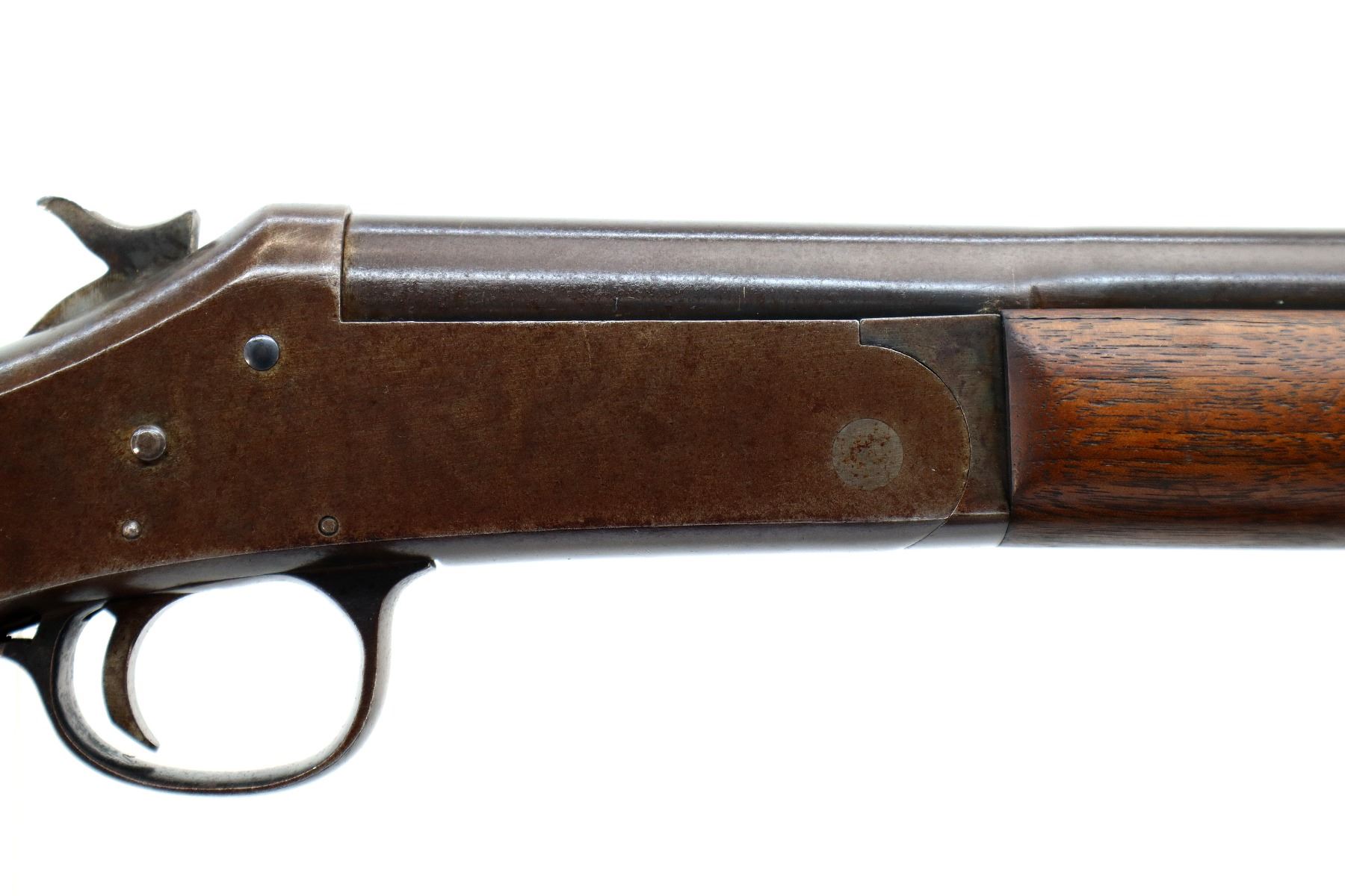 Main Description: Broken bead, blued finish, round barrel, colour case hardened receiver, grooved spur hammer, ejector. Two piece wood stocks, pistol grip cracked behind receiver, missing butt plate and screws.