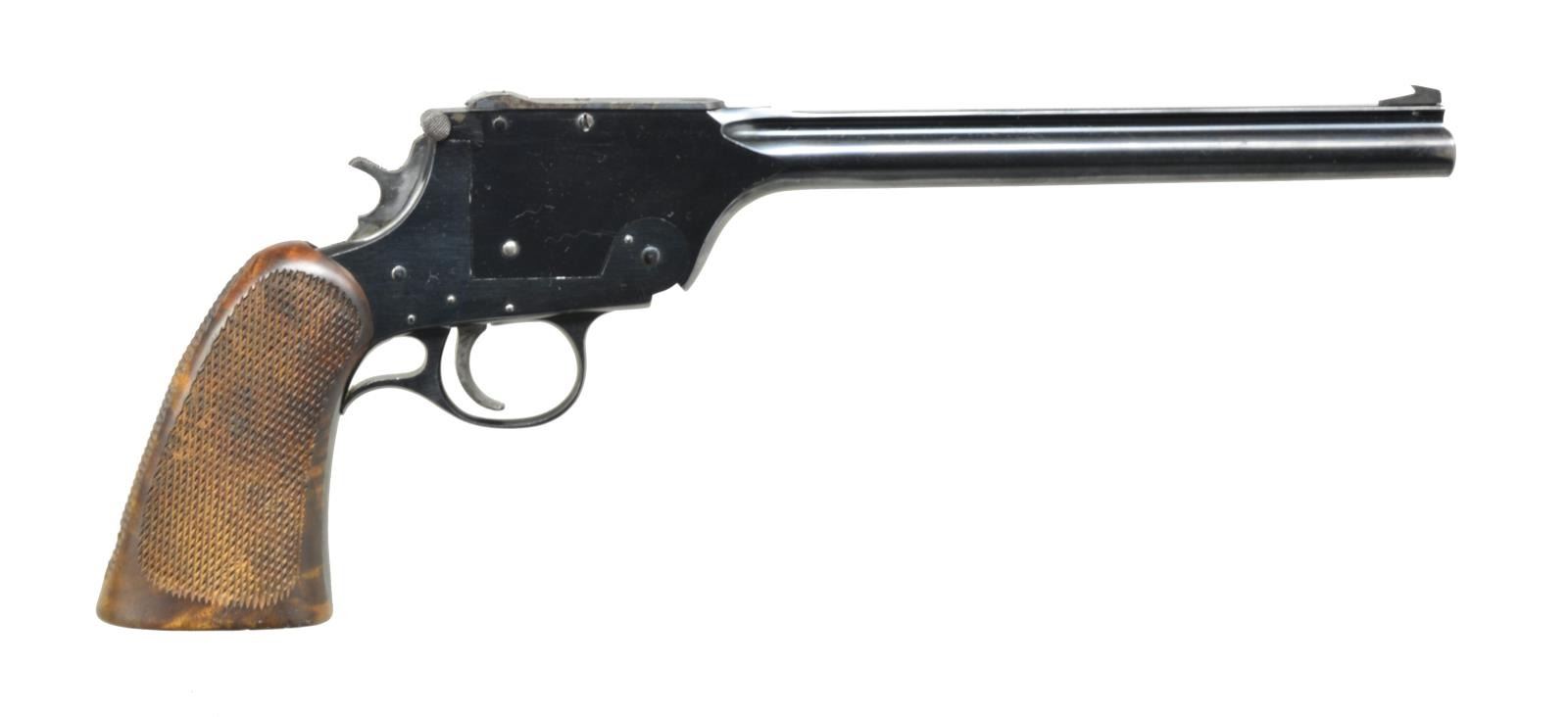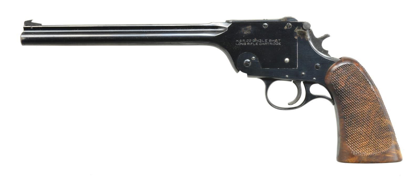 PISTOL. Cal. 22 LR. S# 108. Bbl. 10" rnd. w/ rib. Blade front sight w/ square notch adj. rear sight. Left bbl. flat is marked "H. & R. 22 SINGLE SHOT / LONG RIFLE CARTRIDGE". One of the first 360 guns mfg. before the USRA marking was adopted. Rnd. head ejector. Blued lg. frame top break action w/ short spur hammer. 1 Piece grip of fancy walnut w/ cut checkering. CONDITION: over 95% blue showing a few sm. spots of finish loss & very light. Very good grips. Bright bore w/ strong rifling. (20-4103/DS). CURIO. $700-1,000.