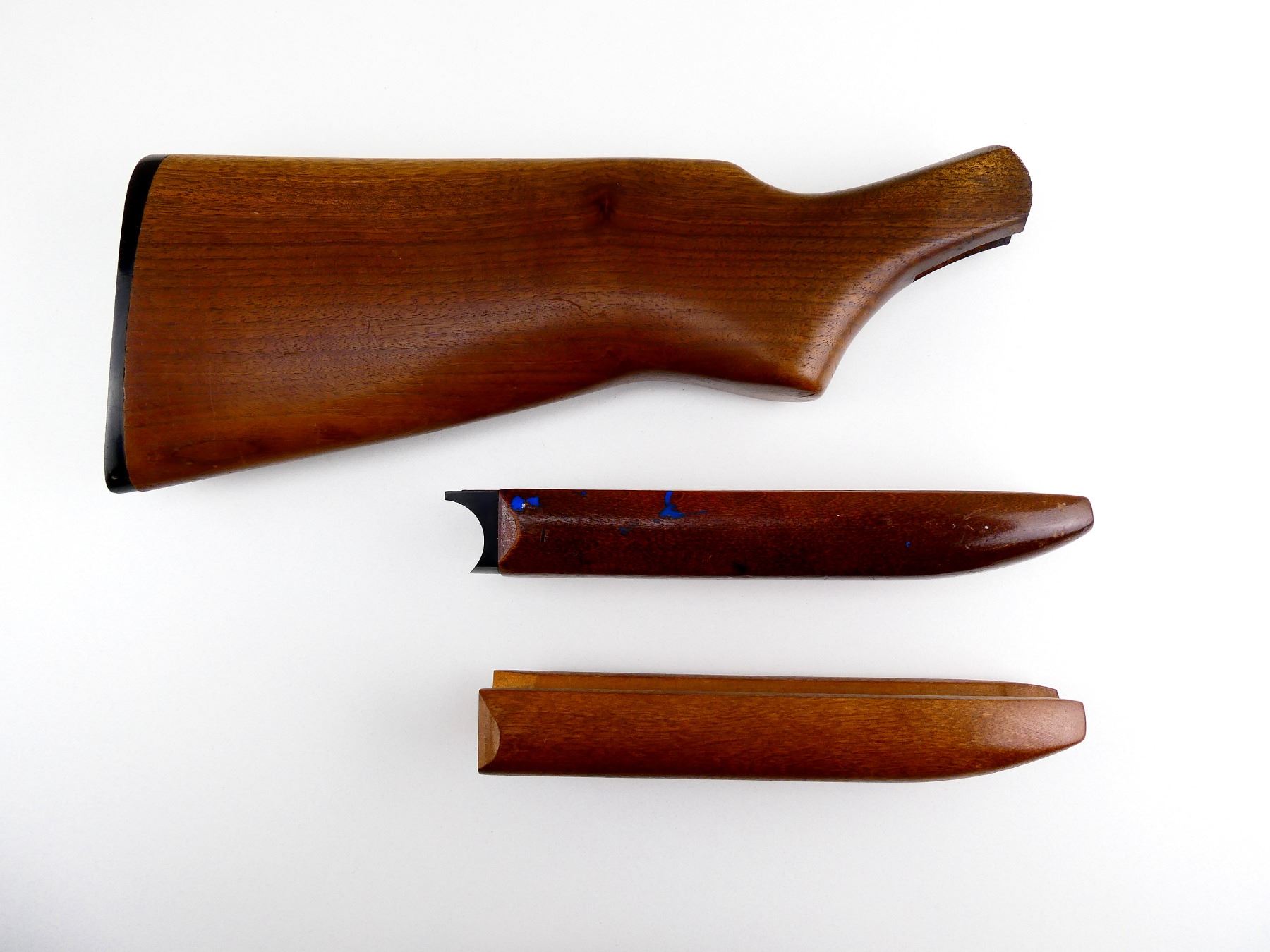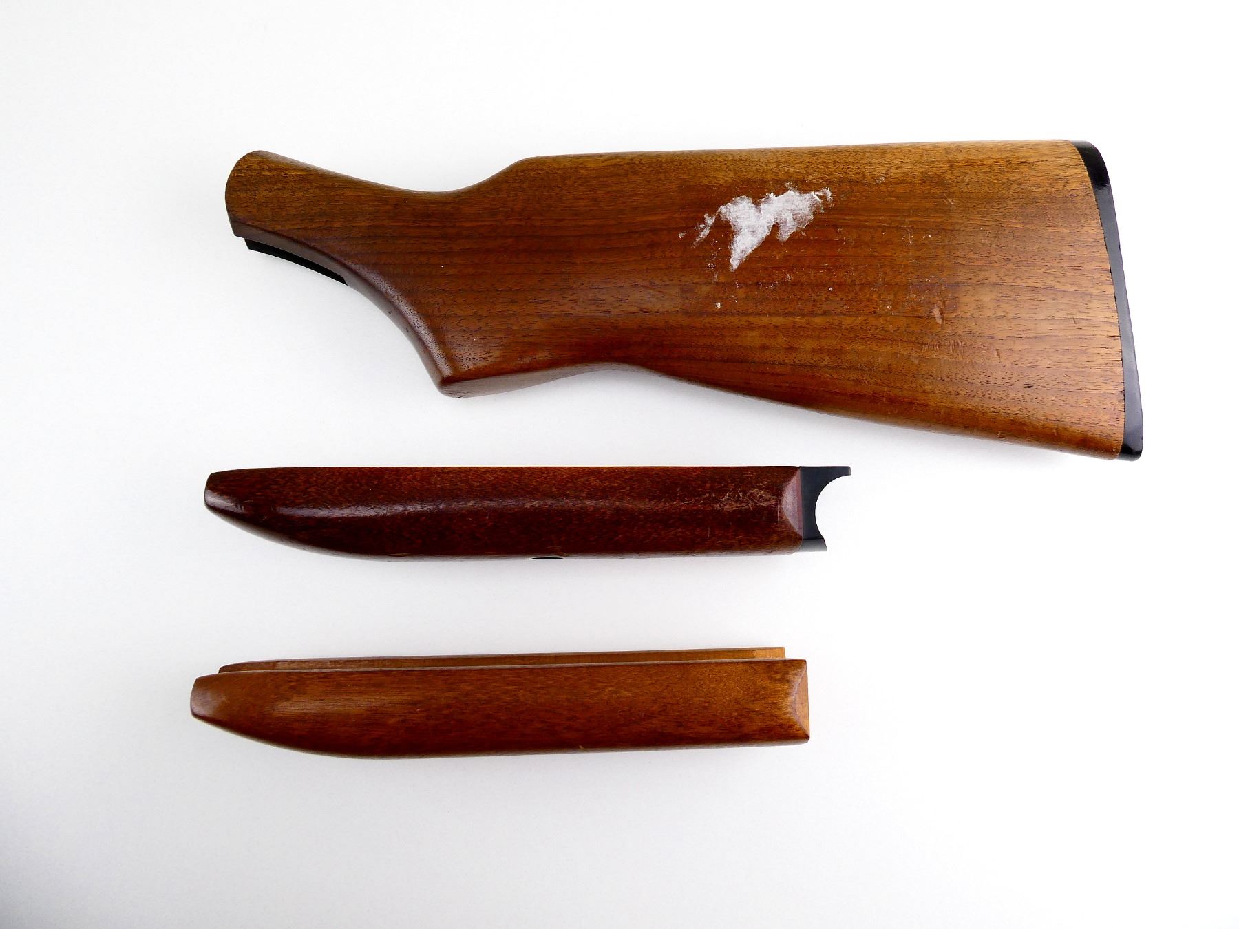 LOT INCLUDES; (1) PISTOL GRIP BUTT STOCK WITH BLACK POLYMER BUTT PLATE, CRACKED, OAL APPROX. 13", (1) SMOOTH FOREND WITH SPACER, FITS 12 G., OAL APPROX. 9" & (1) SMOOTH FOREND, NO PARTS, OAL APPROX. 8.25". MAY REQUIRE FITTING. SEE PHOTOS.