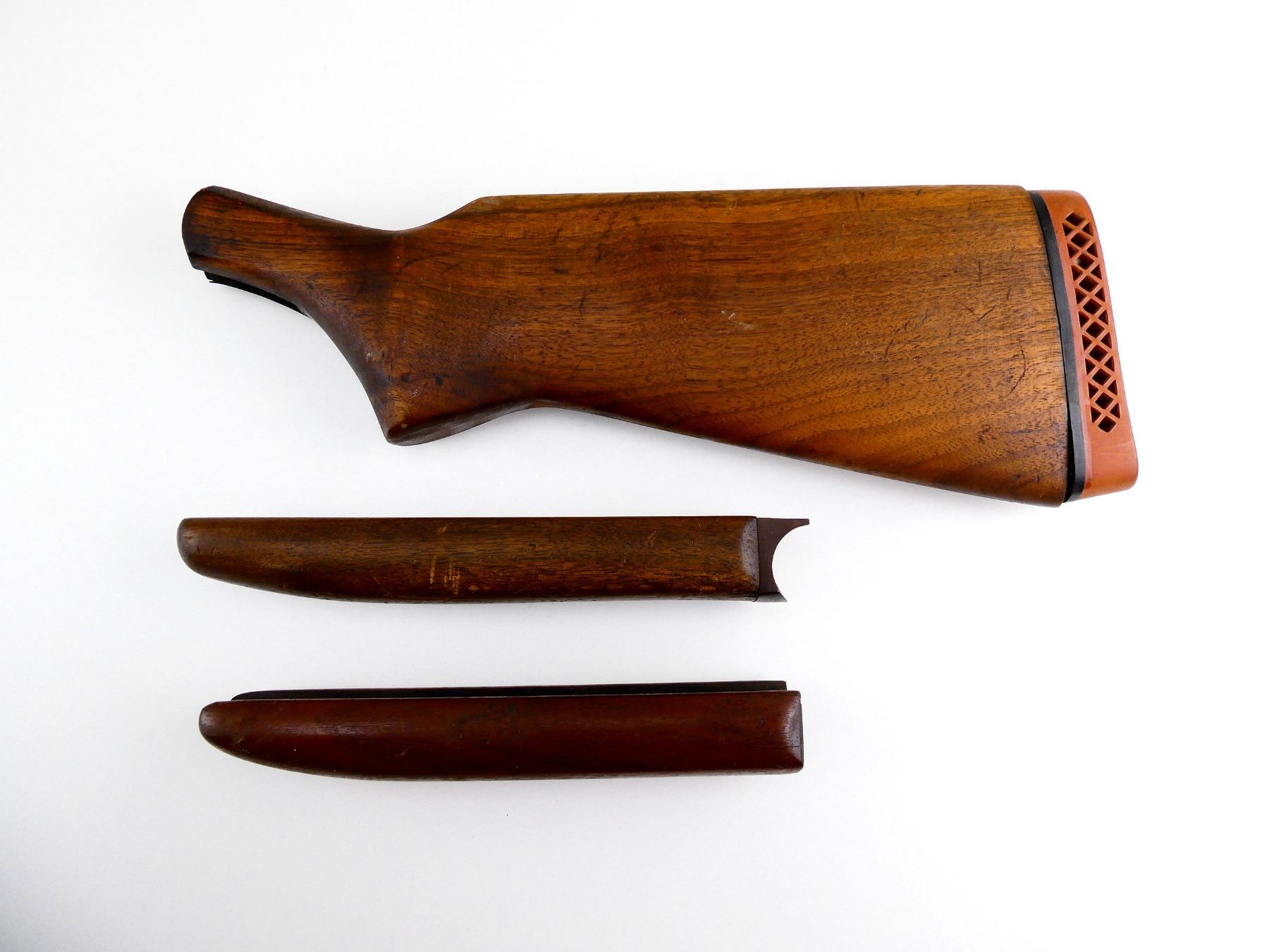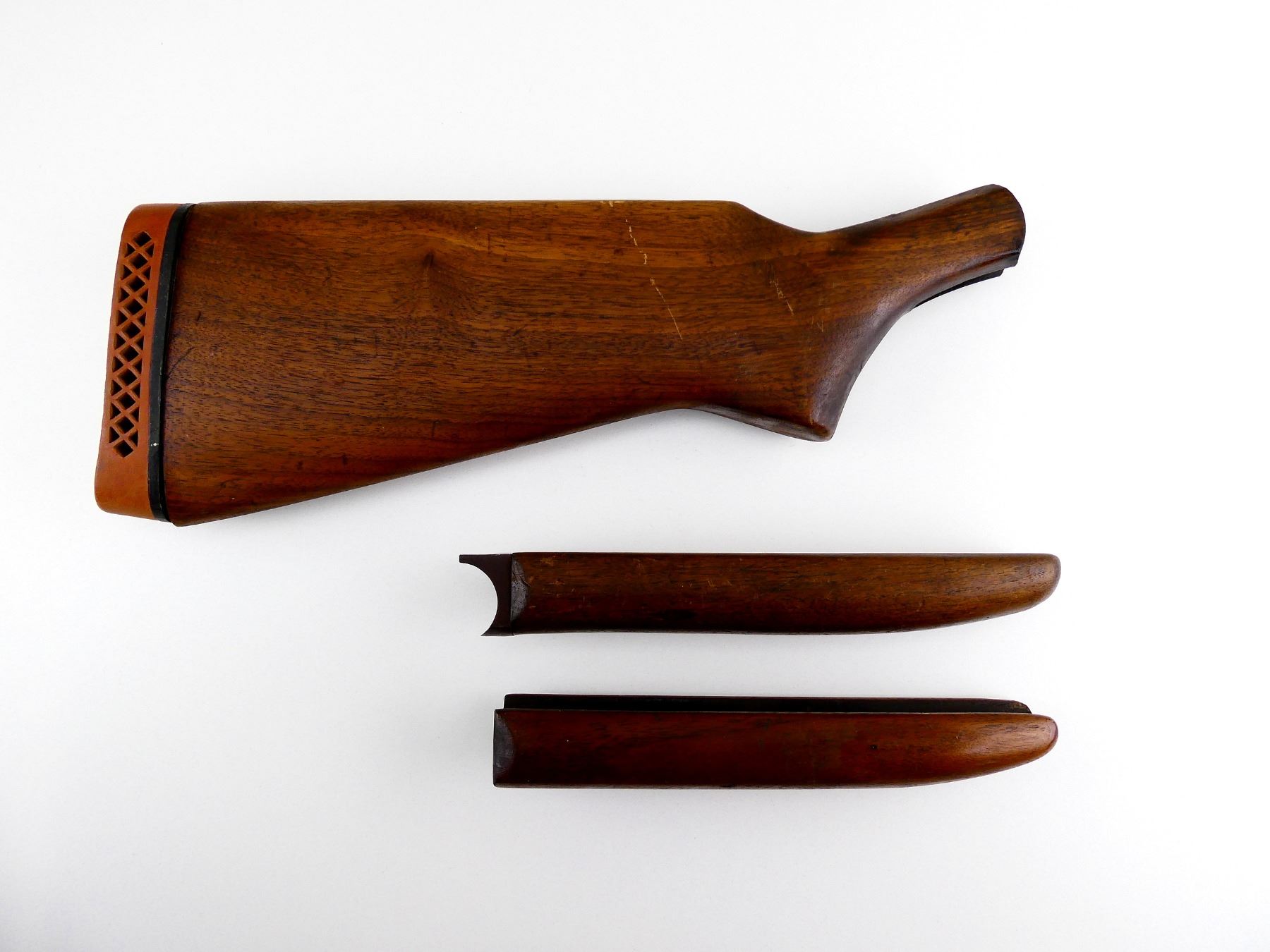 LOT INCLUDES; (1) PISTOL GRIP BUTT STOCK WITH RED RUBBER RECOIL PAD, CRACKED, OAL APPROX. 13.75", (1) SMOOTH FOREND WITH SPACER, FITS 12 G., OAL APPROX. 9" & (1) SMOOTH FOREND, NO PARTS, FITS 12 G., OAL APPROX. 8.25". MAY REQUIRE FITTING. SEE PHOTOS.