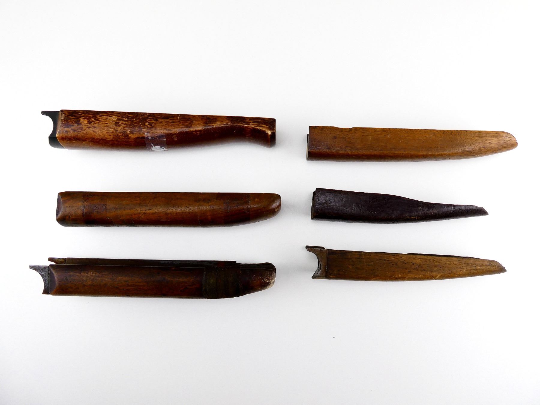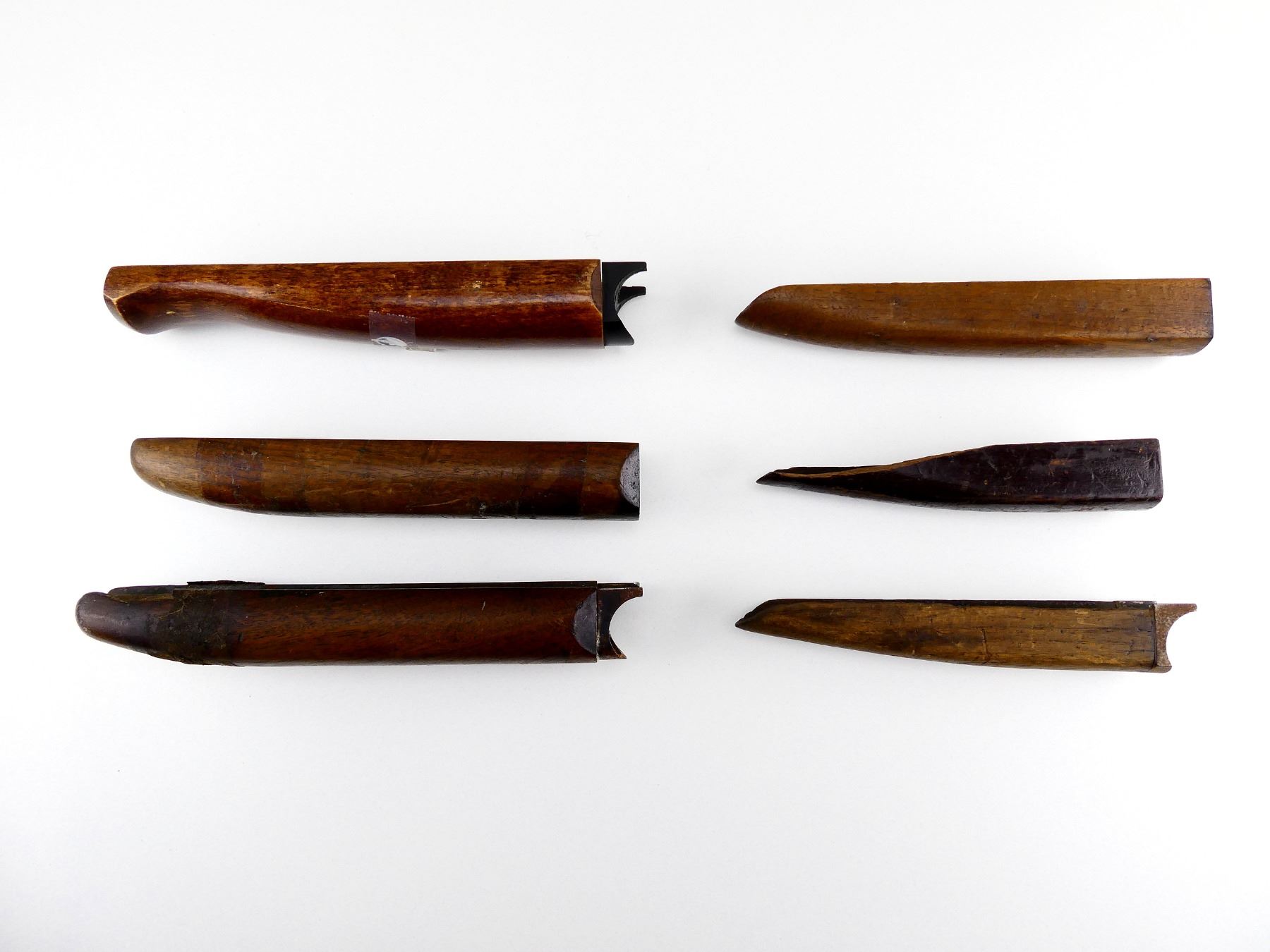 LOT INCLUDES; (6) WOODEN FORENDS, TWO WITH SPACERS, ASSORTED MODELS / STYLES, HAVE SMALL CRACKS & CHIPS, OAL APPROX. 6.75"-9". MAY REQUIRE FITTING. SEE PHOTOS.