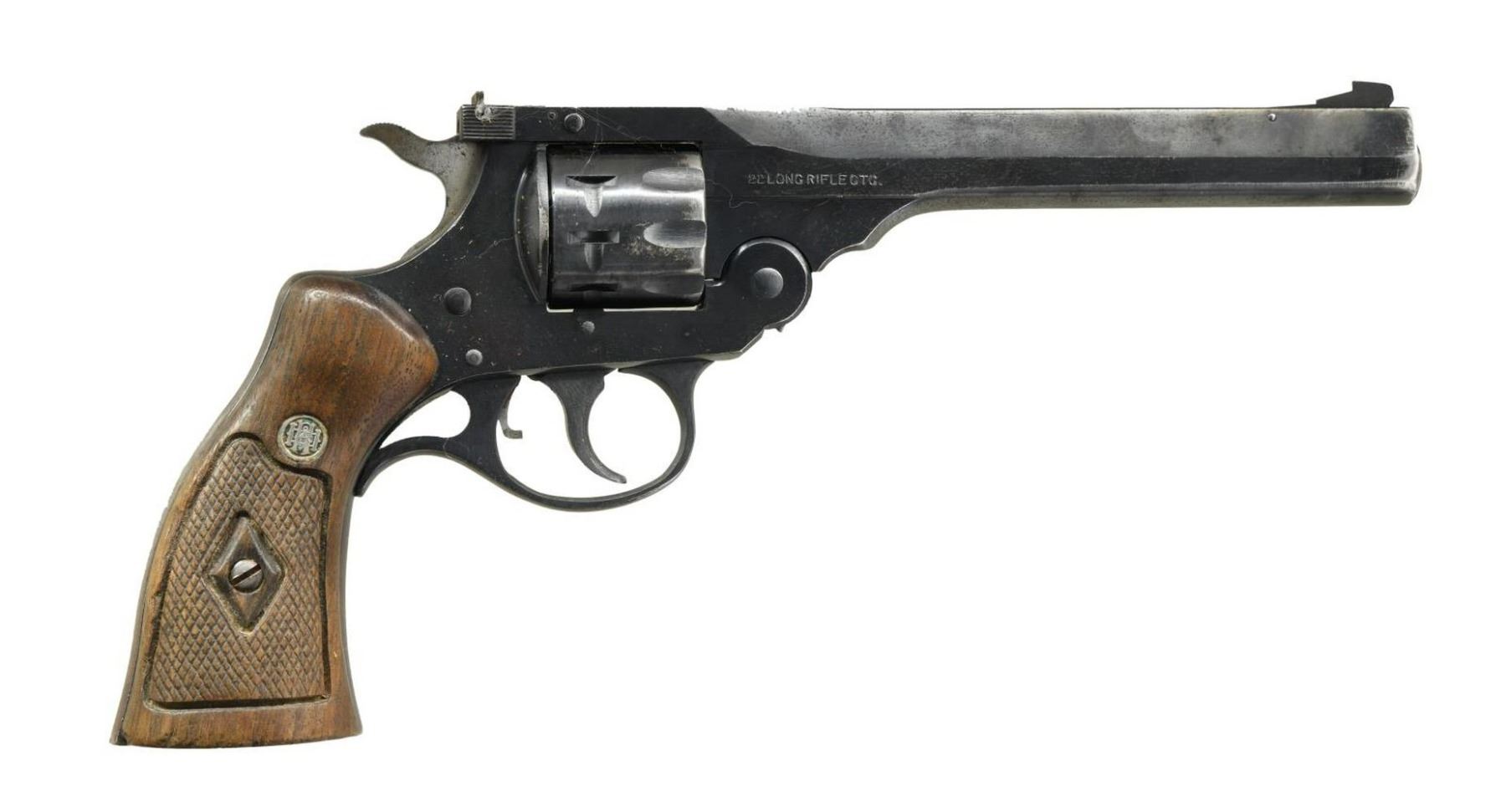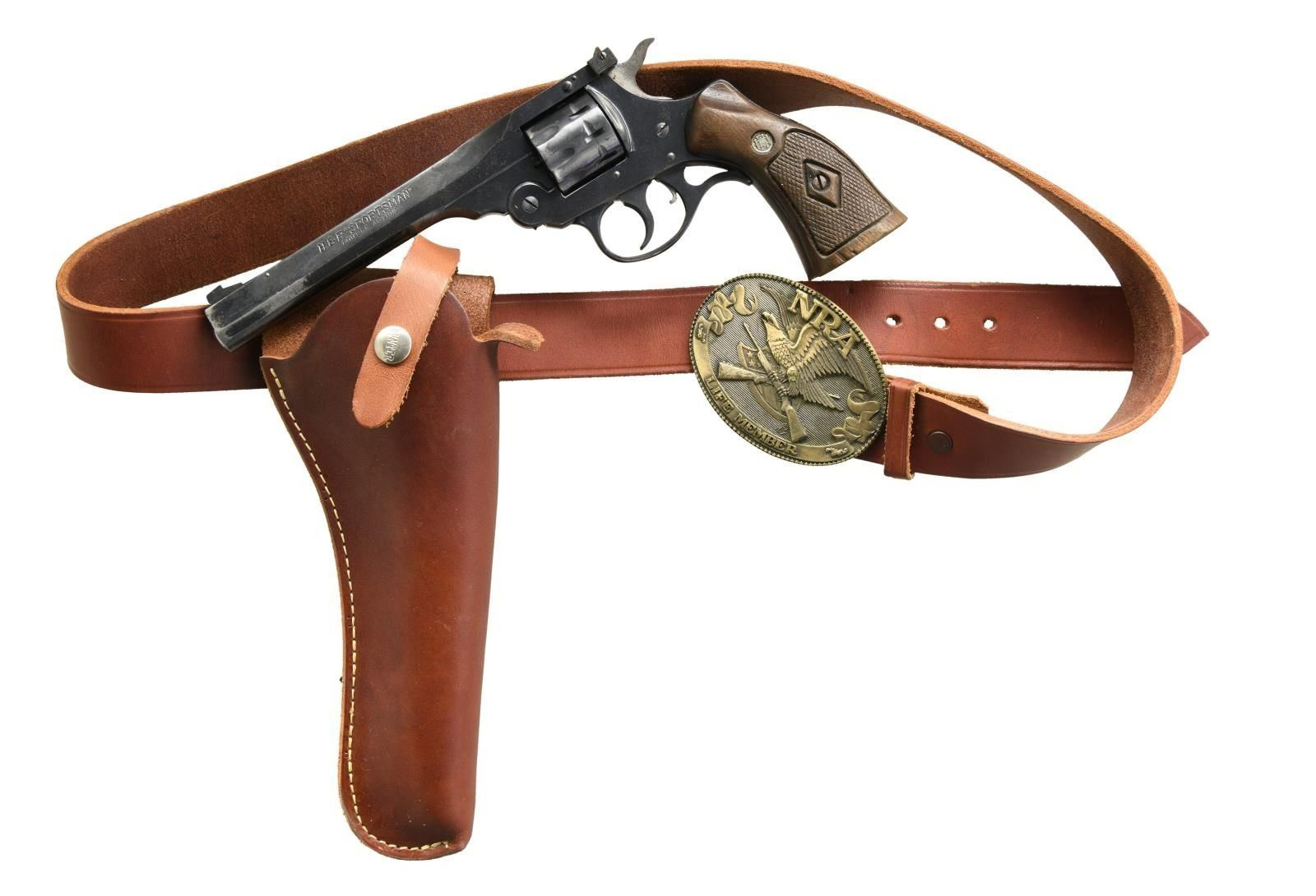 REVOLVER WITH BELT & HOLSTER. Cal. 22 LR. S# R55614. Bbl. 6". Sportsman double action revolver mfg. by Harrington & Richardson. The left side of the bbl. is marked "H.&R. "SPORTSMAN"/ DOUBLE ACTION", with the cal. designation marked on the right. Metal components exhibit a blued finish, with the frame being mounted with 2 piece checkered wood grips. Blade front sight with square notch rear sight. UNATTACHED ACCESSORIES: Leather belt with NRA Life Member buckle and Hunter brown leather holster. CONDITION: metal components retain the majority of their original factory blue finish, exhibiting areas of wear and thinning that show through to gray patina, with light surface oxidation overall. Mirror bore, exhibiting strong rifling throughout. Grips exhibit smoothing and some chips, but otherwise remain sturdy and serviceable. Belt and holster are very good overall. (23-5502/MLW). CURIO. $200-300.
