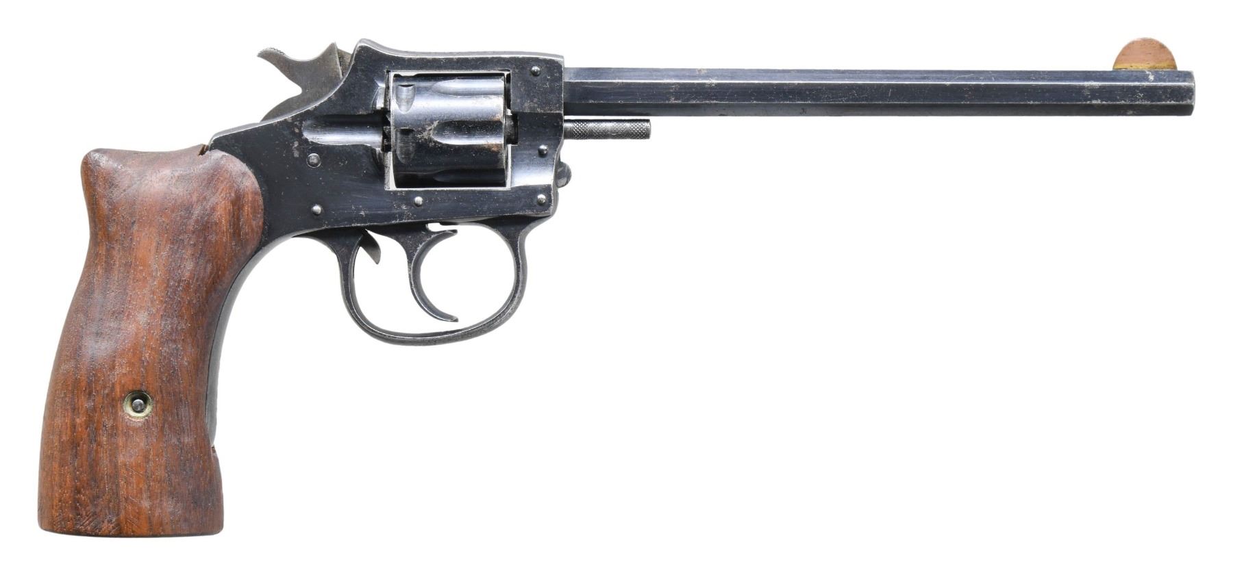 Cal. 22 LR. S# 170275. Appears to be early Model 922 w/ oct. 6". 6 shot cyl. Blued finish. Saw handle smooth walnut grips. CONDITION: good blue with edge wear, spots of oxidation, finish loss & marks. Good grips with marks. Good shiny strong bore. (25-4362/MD). CURIO. $100-200.