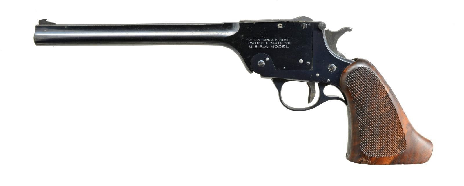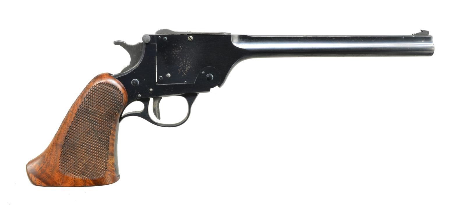 TARGET PISTOL. Cal. 22 LR. S# 2022. Bbl. 10" rnd. w/ rib. Adj. blade front sight w/ adj. square notch rear sight. Lg. frame tip up action w/ blue finish. Bright finished trigger w/ rare long throw hammer. 1 Piece wide butt checkered grip of fancy walnut. CONDITION: over 90% blue showing scattered spots of freckling. Grips show light wear w/ handling marks & sm. chips along butt & rear edges. Bright bore w/ strong rifling. (20-4099/DS). CURIO. $800-1,200.