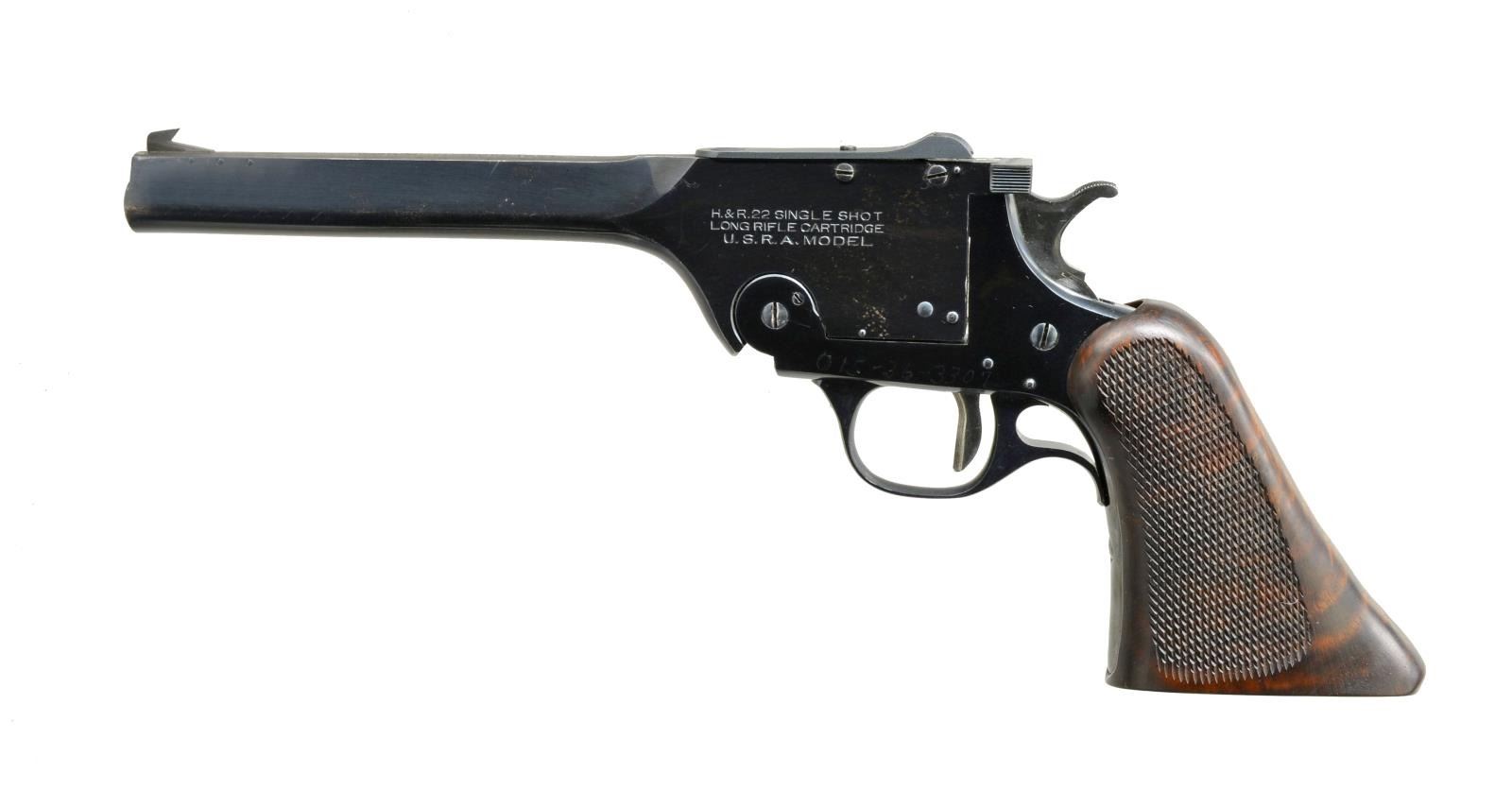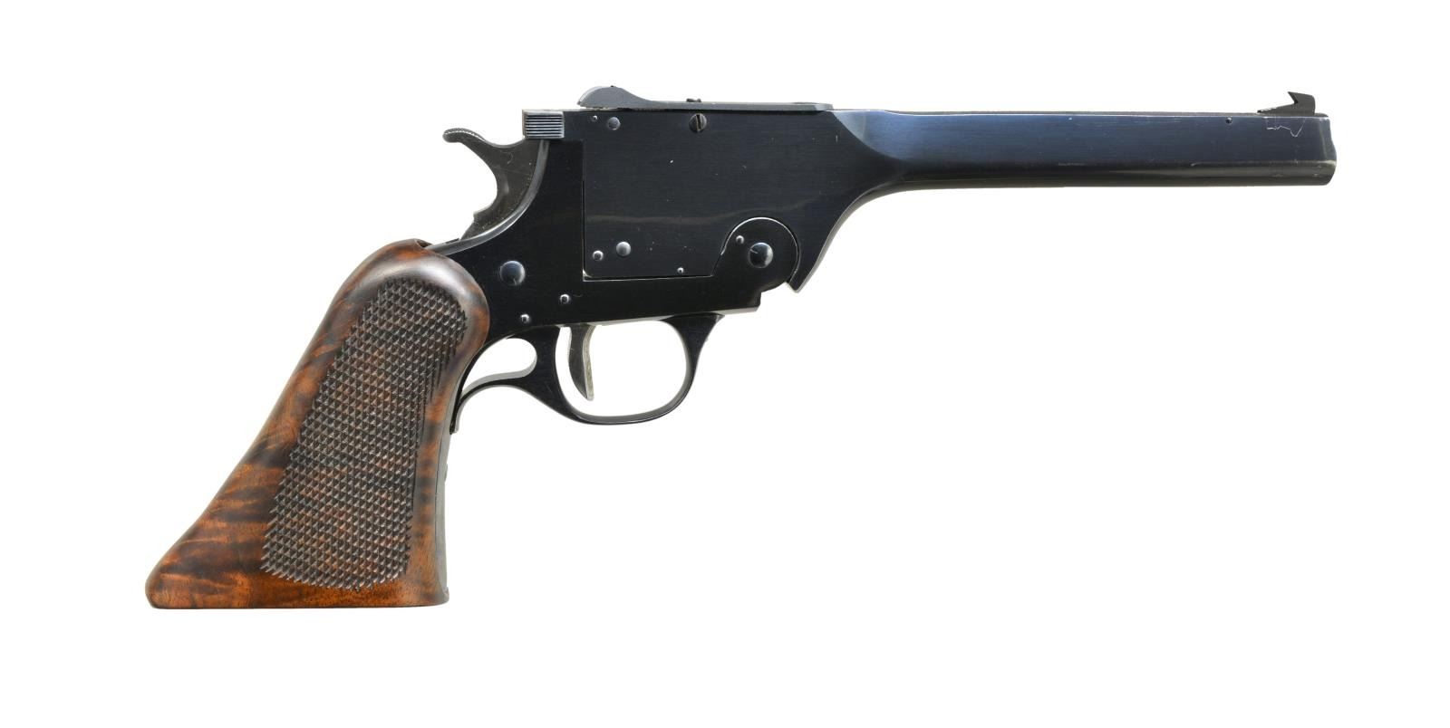 TARGET PISTOL. Cal. 22 LR. S# 2635. Bbl. scarce 8" w/ matte finished top. Adj. blade front sight w/ square notch adj. rear sight. Lg. frame tip up action w/ blue finish having bright polished hammer & trigger. Wide butt fancy walnut checkered grip w/ scarce front screw attachment. UNATTACHED ACCESSORIES: Social Security Death Index search results indicating prior owner based on SSN scratched into left side of gun who was a Mass. resident & passed away in 1981. CONDITION: over 95% blue showing handling mark w/ spots of corrosion & light pitting. Left side of hand scratched number. Grips show light wear. Bright bore w/ strong rifling. (20-4101/DS). CURIO. $650-900.