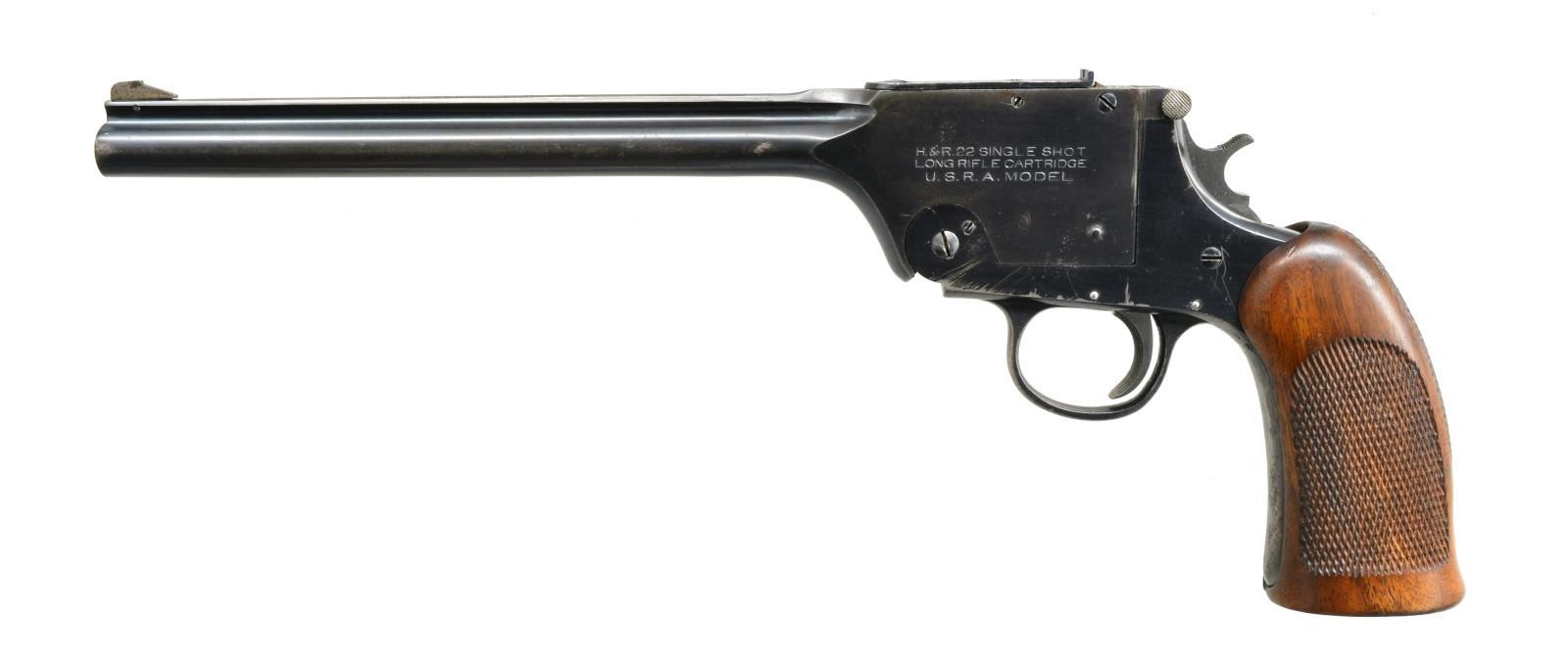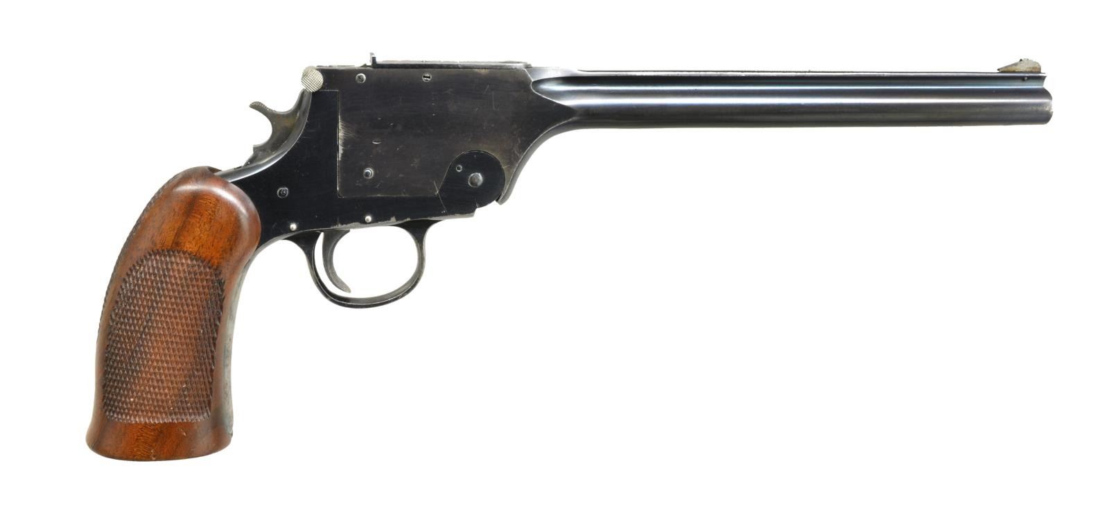 TARGET PISTOL. Cal. 22 LR. S# 416. Bbl. 10" rnd. w/ rib. Non adj. blade front sight w/ square notch rear sight. Rnd. style ejector head. Lg. frame tip up action w/ blue finish having bright polished trigger & short spur hammer. 1 Piece checkered walnut grip. CONDITION: 70% lightly faded blue showing scratches w/ edge & grip strap wear. Grips show handling marks & sm. chip at butt. Bore retains generally sound rifling showing sm. spots of pitting. (20-4102/DS). CURIO. $650-900.