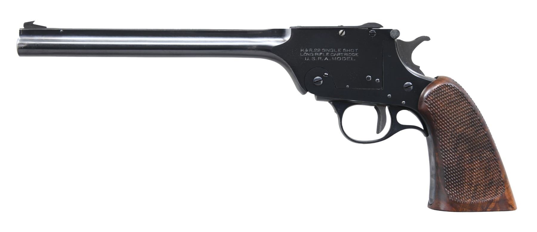 PISTOL. Cal. 22 LR. S# 1997. Appears to be 4th Variation w/ 10" barrel. Hooked Patridge blade front sight & square notch rear sight. Long hammer spur. Lever type ejector. "T" barrel latch with round checkered ends. Straight grooved trigger. One piece checkered walnut grip. CONDITION: very good blue mixed with scattered areas of worn finish & pinprick patina. Very good Grip with small marks. Shiny bore with strong rifling. (24-6974/MD). CURIO. $600-1000.