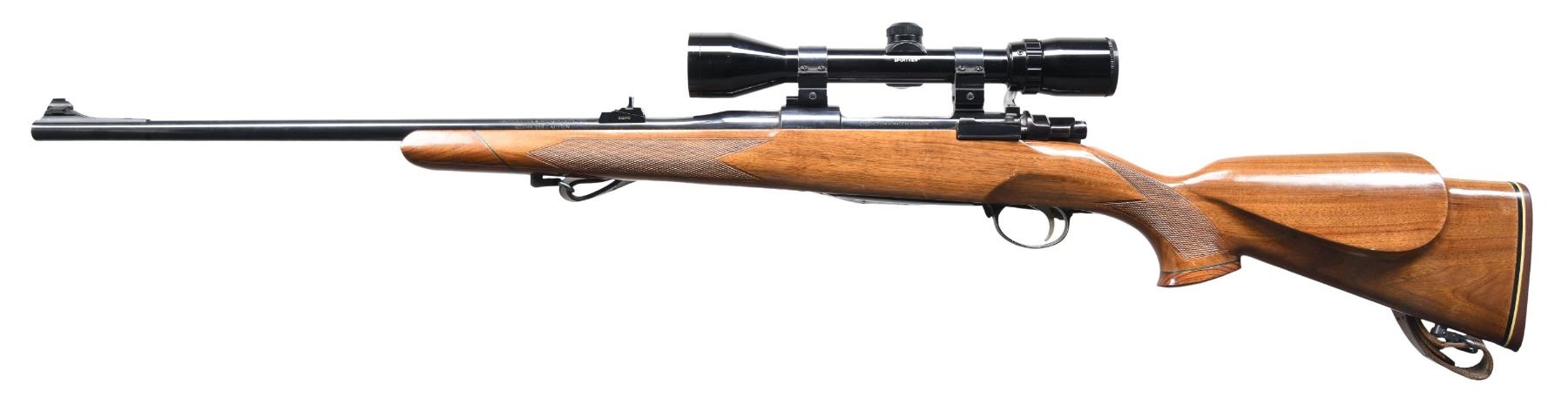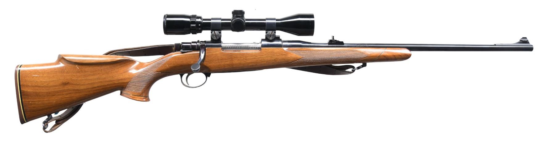 Cal. 270 Win. S# 52601. FN Action mfg. between 1965-1972. Bbl. 22". Ramp front sight with Williams replacement blade and Williams rear sight. Bushnell Sportview 3-9x scope with fast focus and duplex reticle on Weaver 1" rings and bases. Checkered American walnut Monte Carlo stock with rollover cheekpiece, contrasting wood grip cap & forearm tip, and brown pad. Brown leather sling. CONDITION: Very good overall appearance with handling marks and some heavier wear on the buttstock. Shiny bore with strong rifling. Scope has a very good finish with serviceable optics. (24-7146/MD). CURIO. $300-450.