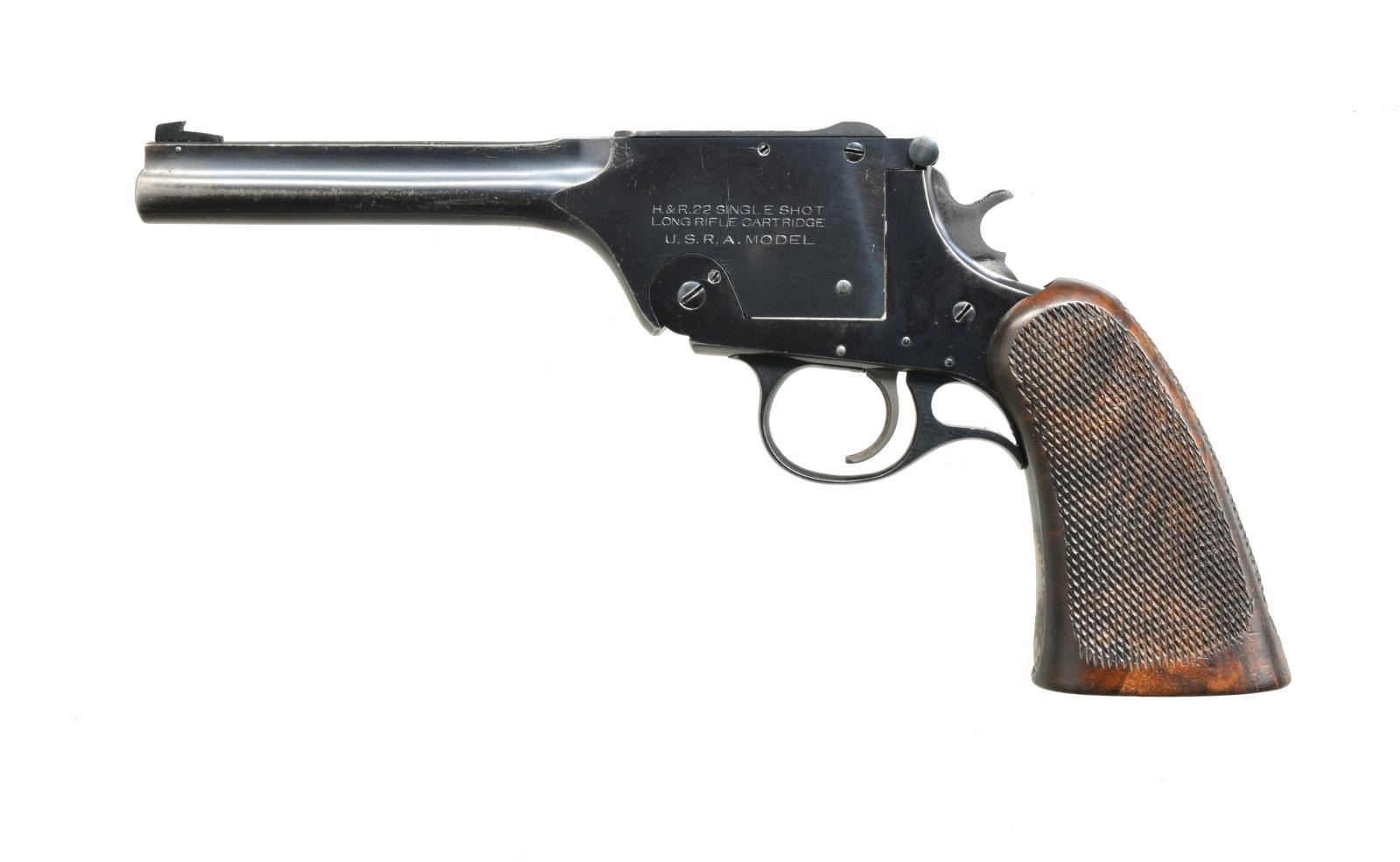 Cal. 22 LR. S# 1463. Bbl. 7". Blade front sight w/ square notch adj. rear sight. Rnd. head ejector. Lg. frame top break revolver w/ blue finish & short spur hammer. 1 Piece fancy walnut grip w/ hand checkering. CONDITION: 75% thinning blue showing edge muzzle & grip strap wear. Grips show scratches & dents w/ sm. chips at butt. Bright bore w/ strong rifling. (20-4104/DS). CURIO. $700-1,000.