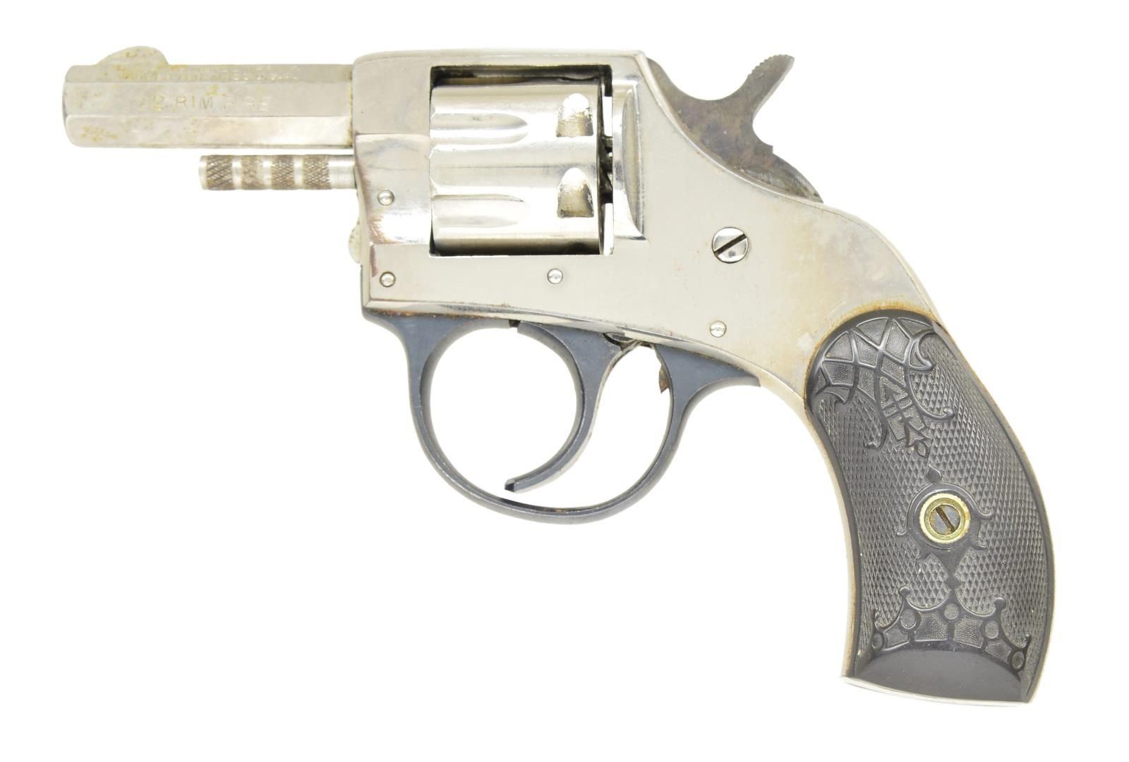 Cal. 22 RF. S# 462684. Bbl. 2" oct. w/ fixed sights. Nickel finish w/ blued triggerguard. 7 Shot fluted cyl. Matching numbered 2 piece hard rubber grips. CONDITION: very good nickel w/ light patina & scratches. Good grips. Action does not cycle properly, trigger return spring broken. Very good bore. (23-575/MD). CURIO. $75-125.