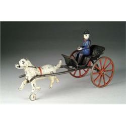 HARRIS DOG CART. A black enamel cart w/red spoke wheels and a black yoke supporting a running white dog with red harness being driven by a boy wearing a blue suit and black cap. This is a very charming toy! SIZE: 9-1/2” l. CONDITION: Overall very good. MC 1-3819 (700-900)