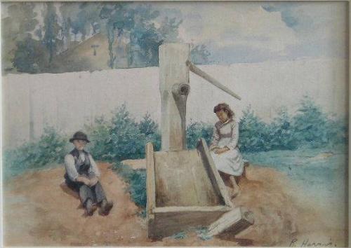 HARRIS, Robert, P.R.C.A., 1849-1919. "At the Pump". Aquarelle, signée. Watercolour, signed. 9" x 13" - 22.8cm x 33cm.