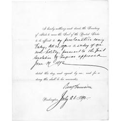 (1833 - 1901) 23rd President of the United States. Fine and important content D.S. "Benj. Harrison" as President, 1p. 4to., Washington, July 21, 1892 in which Harrison orders the Secretary of State to affix the seal of the United States on his "...proclamation naming Friday, Oct. 21, 1892, as a day of general holiday, pursuant to the Joint Resolution of Congress approved June 29, 1892..." The holiday in question was to commemorate the 400th. anniversary of the landing of Columbus in America! Although Columbus Day had been celebrated by various Italian-American groups since the 1860's, this was the first time it was made a federal holiday. Although the holiday was always celebrated on October 12, the day Columbus landed in the Bahamas, Congress and Hayes chose October 21 because it was also the day for dedication ceremonies for the World Colombian Exposition in Chicago (which did not officially open until May 1, 1893). The day was officially billed as "National Colombian Public School Celebration of October 21, 1892" which included the first public recitation of the Pledge of Allegiance by an estimated 10 million school children across the country which had been written by Francis Bellamy in that year. The official programme of activities on that day also called for pupils, after the recitation of the pledge, to say in unison "One Country! One Language, One Flag!". This was likely a reaction to the millions of southern and eastern Europeans who were just arriving in the United States, causing a great measure of discomfort to "native" Americans. We don't know if anyone at the time detected the irony of the fact that Columbus was an Italian. Columbus day would not, however, become a regular holiday until Franklin D. Roosevelt proclaimed October 12, 1937. Usual folds, otherwise very good to fine condition.
