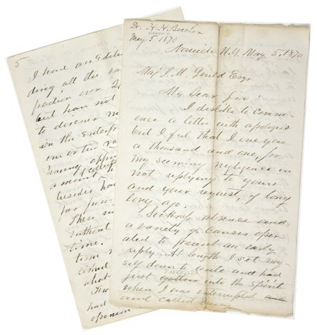 (1806 - 1889) Civil War surgeon attached to the 114th Regiment, New York State Volunteers, distinguished himself in the Battle of Pleasant Hill. He would later author several important books on Civil War history. Interesting A.L.S. 8pp. 8vo., May 5, 1870, Norwich, New York. Beecher goes into extensive detail describing the problems he incurred publishing his acclaimed volume The History of the 114th Regiment, in small part: "...I was upon the point of sending you a copy of my Record of the 114th...I have several styles of my work with prices as follows: Cloth - $2.50...I expected to have a uniform cloth edition of about 450 pages at $2.50; but I soon found that I could not compose the matter...so I increased it to its present size, adding also the plates which were not presently considered and extended by nearly one-quarter the actual cost. A price was named and advertised and subscribed to at $3.00 per copy...over 2000 copies but have not been able to deduce much money in the enterprise as yet, one or two rascally agents having appropriated quite an amount of my money...". Beecher continues to try to sell the recipient the cloth bindings and pages from un-fabricated books and unbound editions for 27 cents per copy: "...I have proud satisfaction of knowing that my feeble efforts have proved acceptable to the gallant men of my Regiment and their friends for whom will benefit. Copies of the record have found its way transported to other lands and the islands across the sea...". Ironically, Beecher's "acclaimed" volume would not receive a proper printing and distribution until 1908, nineteen years after his death! Toned at folds, else very good.