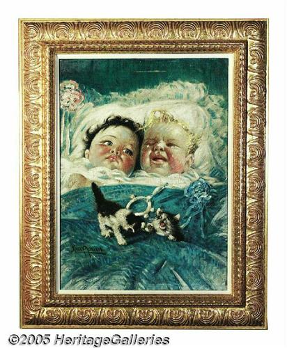 <B>HARRY HERMAN ROSELAND (American 1866-1950)</B></I> <BR>Sunshine and Rain: Two Babies <BR>Oil on canvas<BR> 18.75in. x 13in. <BR>Signed lower left<BR>Old Sears and Roebuck label on reverse inscribed: Harry Roseland/ [S]unshine and Rai[n] <BR>Provenance: Butterfield's December 8, 1998, lot 1814<BR><BR>Condition Report: Canvas has been cut from stretcher and adhered to board, board is significantly deteriorated along right edge, canvas is cut (2in.) along left edge, gold scuff across top of canvas, surface dirt and old varnish<BR>
