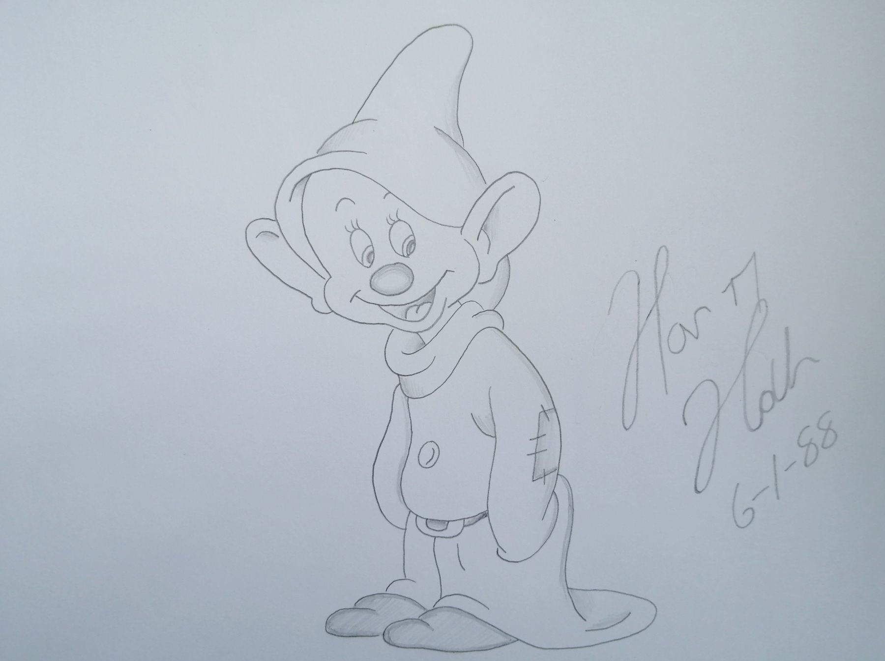 Harry Holt drawing of Dopey. 8.5x6 inches - Until he turned 83 years old, he sat behind an animator's desk interacting with guests. Originally, the job was to promote the opening of the Disney-MGM Studios with its new animation studio, but Holt proved so popular and beloved that he remained there for seven years, working limited hours five days a week.